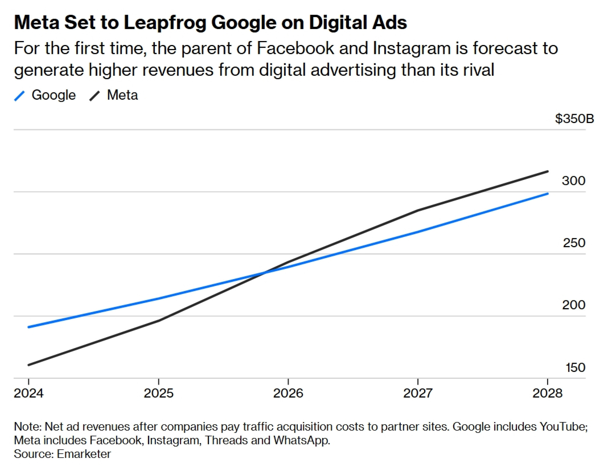 Do kraja godine doći će do smjene straže: Meta Platforms Inc. će prvi put nadmašiti Alphabetov Google po ukupnim prihodima od digitalnog oglašavanja, kako na globalnoj razini, tako i u SAD-u. Bit će to "povijesna prekretnica" i "veliko iznenađenje", prema analitičarima Emarketera, tvrtke za istraživanje tržišta koja je iznijela ovu projekciju.