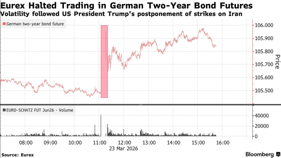 Trgovanje terminskim ugovorima na dvogodišnje njemačke državne obveznice bilo je dvaput obustavljeno u ponedjeljak, što je trgovcima otežalo praćenje naglih promjena potaknutih odlukom američkog predsjednika Donalda Trumpa da odustane od napada na iransku energetsku infrastrukturu.