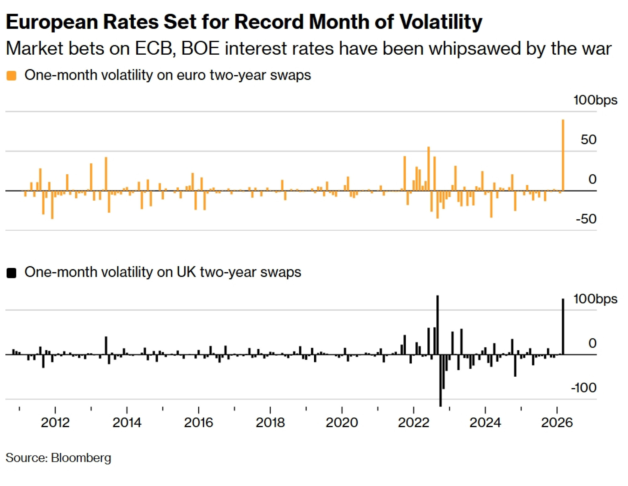 Dvogodišnji swapovi na europske kamatne stope - koji se koriste za klađenje na izglede politike središnje banke – zabilježili su povijesnu volatilnost u ožujku, dok je za britanske ugovore ovo bio najnestabilniji mjesec od rasprodaje koja je dovela do smjene bivše premijerke Liz Truss 2022. godine.