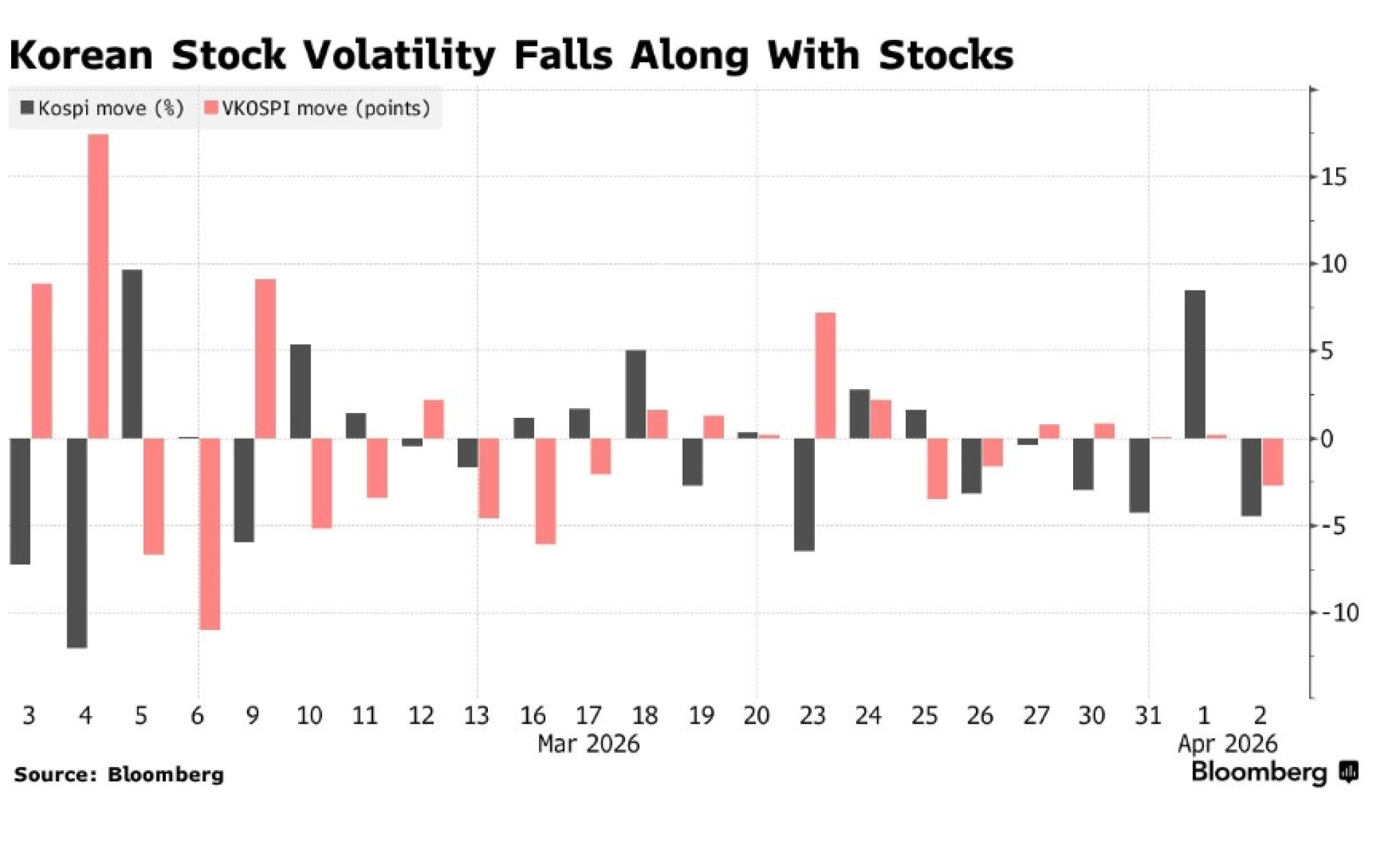 Ipak, pokazatelj očekivanih fluktuacija dionica u Koreji također je pao. To je neuobičajena pojava kada cijene dionica padaju i ukazuje na to da se trgovci opcijama klade na smirivanje volatilnosti nakon njezinog nedavnog skoka.