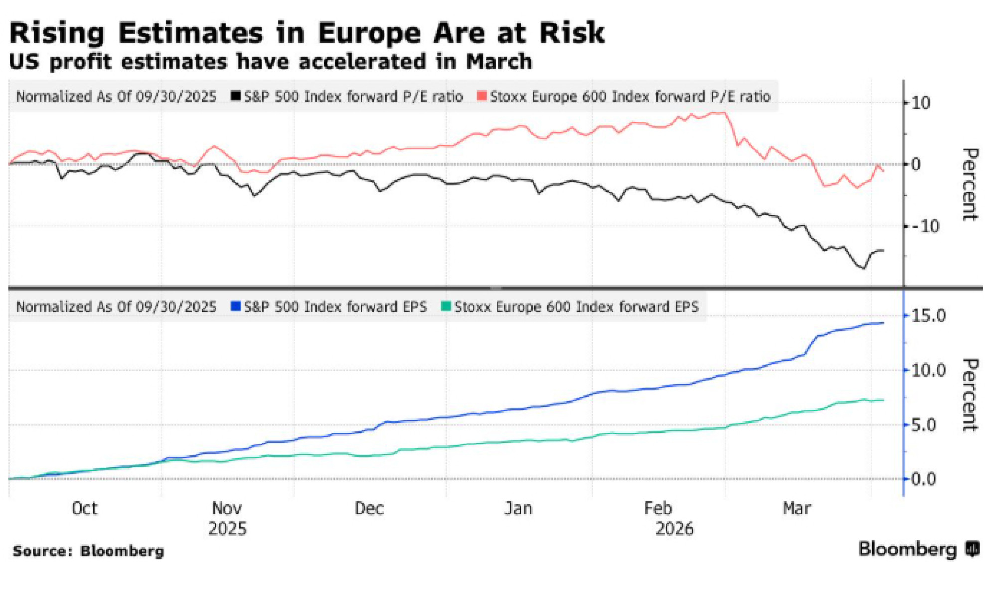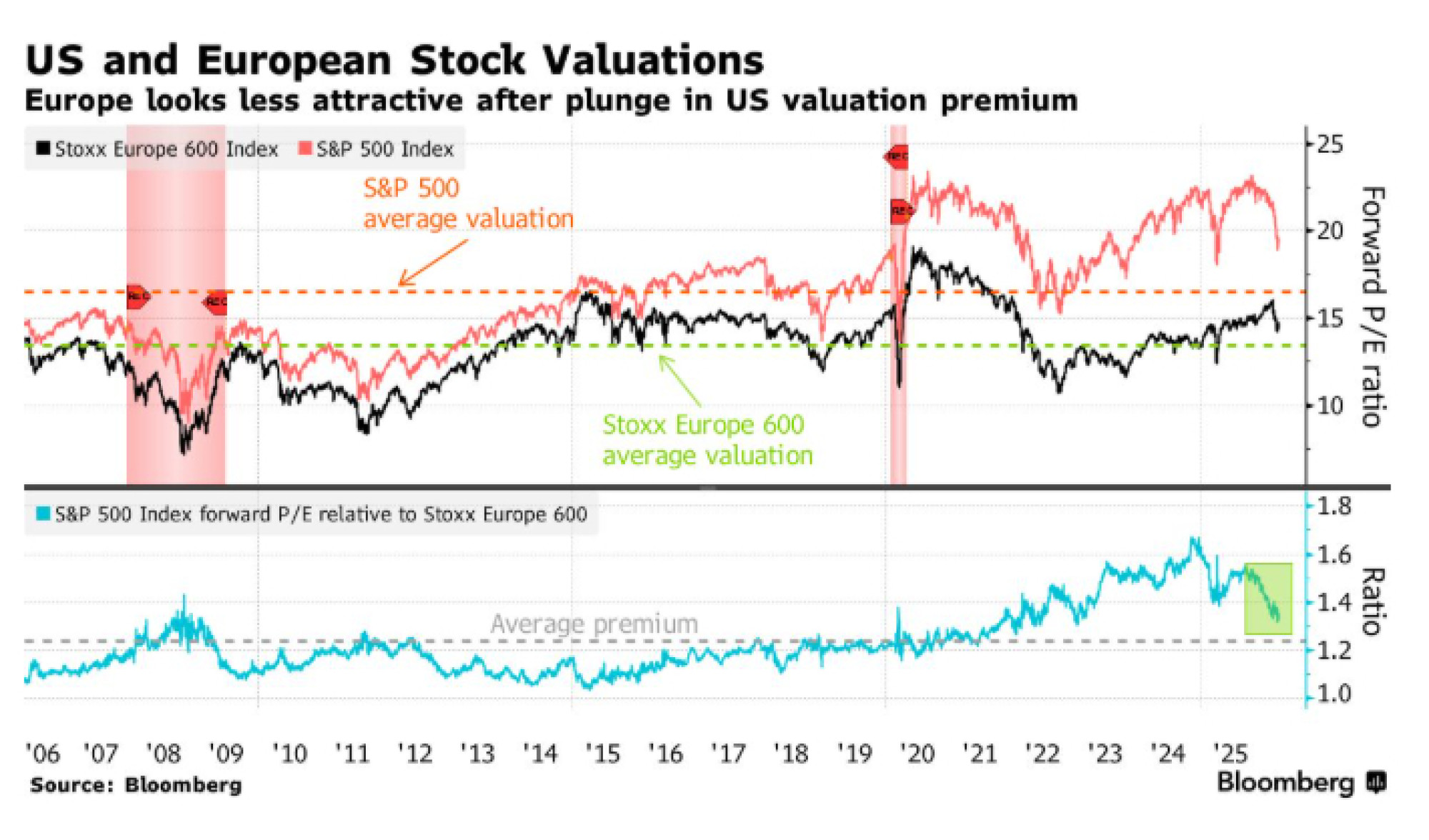 Rat s Iranom pogodio je dionice eurozone snažnije od onih u SAD-u; indeks blue-chip dionica Euro Stoxx 50 pao je za više od sedam posto od početka sukoba, dok je indeks S&P 500 pao manje od četiri posto. Europsko tržište ove godine još uvijek nadmašuje američko, ali situacija se mijenja. U međuvremenu, diskont u vrijednosti u kojem je Europa uživala brzo nestaje, budući da američke dionice doživljavaju vlastito oštro smanjenje vrijednosti (de-rating) koje zatvara taj jaz.