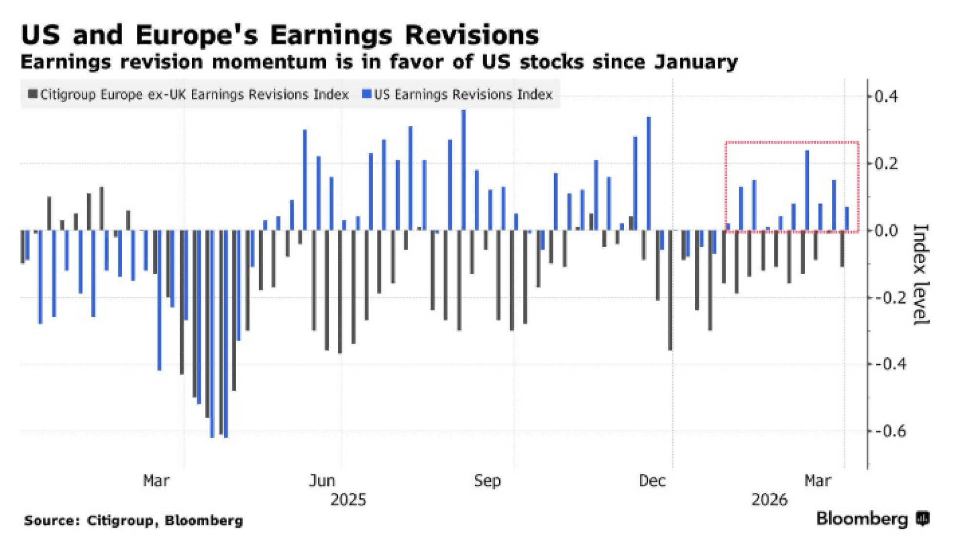 Momentum zarade nagnuo se u korist SAD-a tijekom proteklih nekoliko mjeseci, pri čemu je pokazatelj revizija dobiti po dionici (EPS) u pozitivnom području, što je u oštrom kontrastu s Europom, gdje smanjenja procjena premašuju njihova povećanja. Ipak, iako je SAD energetski neovisan i trebao bi manje ispaštati zbog poremećaja u opskrbi naftom nego Europa, on ima druge probleme koji bi mogli opravdati nedavno smanjenje vrijednosti (de-rating).