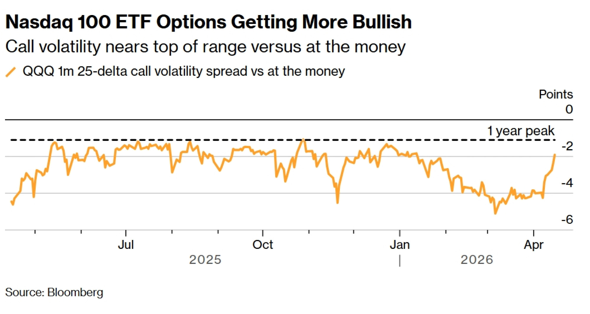 Najmanje jedan pokazatelj signalizira želju trgovaca za ugovorima koji se klade na kratkoročni rast. Implicirana volatilnost za 25-delta call opciju na najveći fond kojim se trguje na burzi (ETF), a koji prati Nasdaq 100, najviša je od sredine siječnja u usporedbi s ugovorima na trenutačnoj tržišnoj razini.