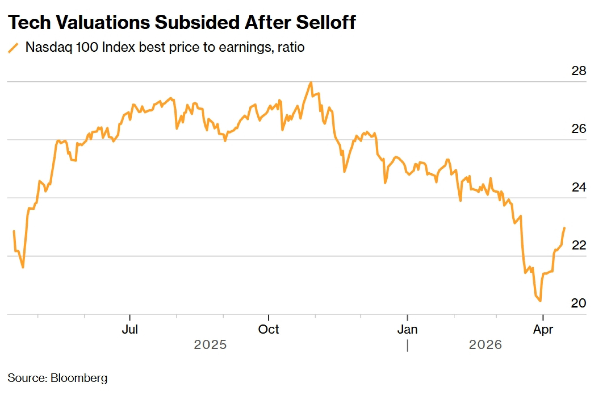 Procjene vrijednosti u tehnološkom sektoru značajno su se smanjile. I S&P 500 informacijsko-tehnološki sektor i Nasdaq 100 sada trguju ispod svojih desetogodišnjih prosječnih terminskih multiplikatora, nudeći ono što neki ulagači smatraju konstruktivnijom ulaznom točkom u dionice rasta s velikom kapitalizacijom.