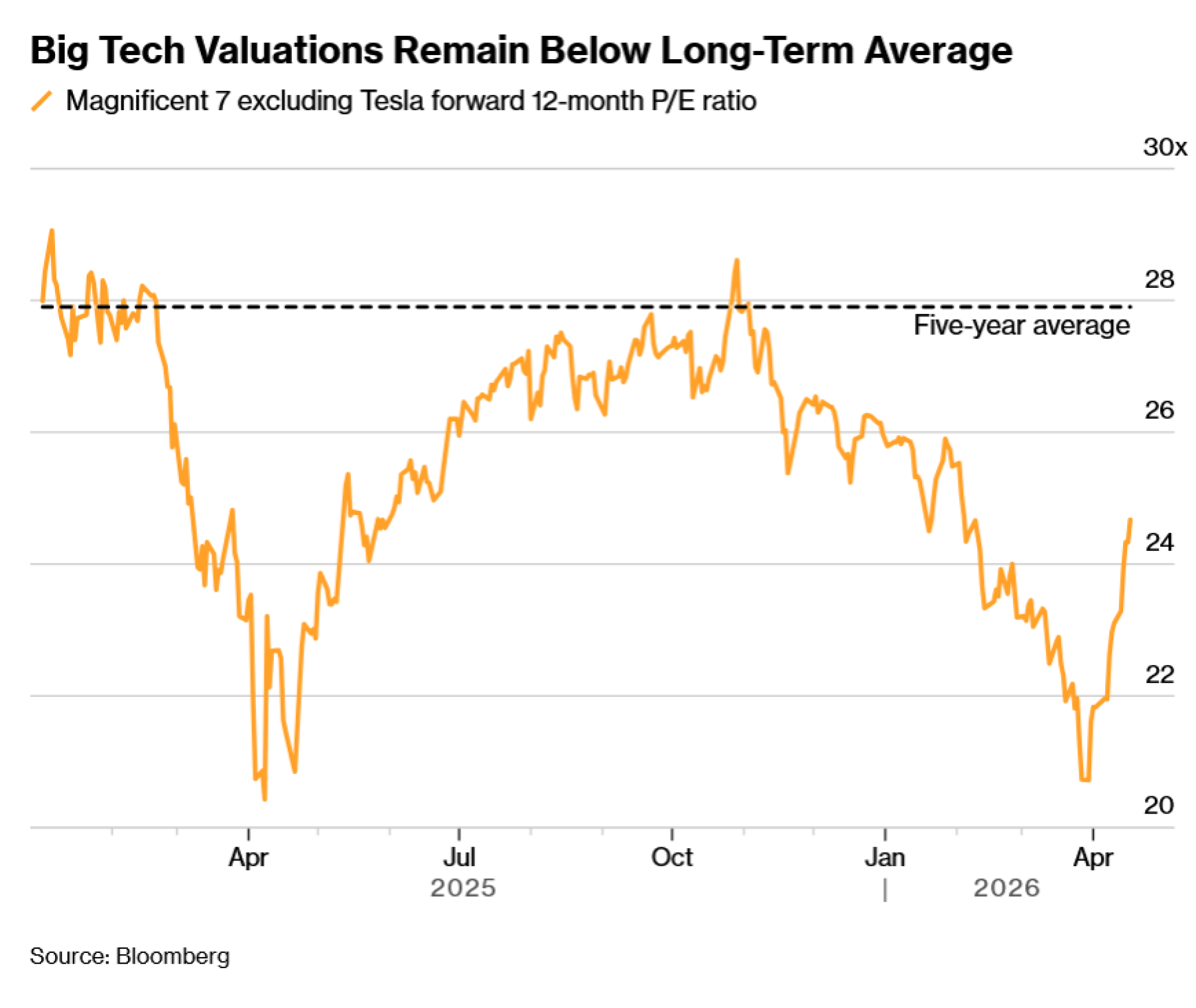 Otkad je S&P 500 30. ožujka dosegnuo najnižu razinu u 2026. godini, tehnološki sektor se transformirao iz najgore skupine u indeksu u najbolju. Indeks koji prati tzv. Veličanstvenu sedmorku (Magnificent Seven) porastao je za 20 posto u tom razdoblju i poništio pad od 17 posto s vrhunca zabilježenog u listopadu. Dionice tvrtke Microsoft Corp. vjerojatno su najizrazitiji primjer tog preokreta: porasle su za 19 posto nakon što su s najviše razine 28. listopada pale za 34 posto na najnižu razinu 27. ožujka.