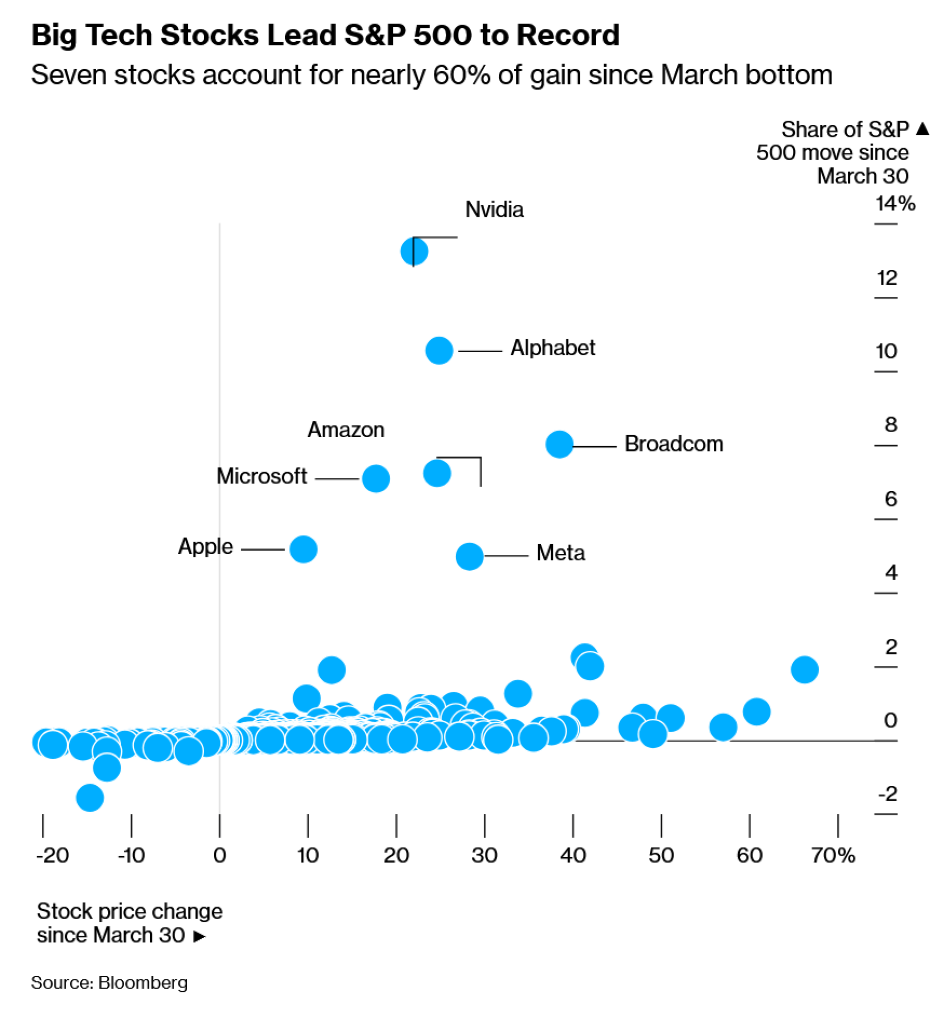Više od polovice nedavnog rasta indeksa S&P 500 dolazi od samo sedam tvrtki: Nvidia Corp., Amazon.com Inc., Microsoft, Broadcom Inc., Alphabet Inc., Meta Platforms Inc. i Apple Inc. One su zajedno u samo nekoliko tjedana povećale svoju tržišnu vrijednost za otprilike četiri bilijuna dolara, prema podacima koje je prikupio Bloomberg.