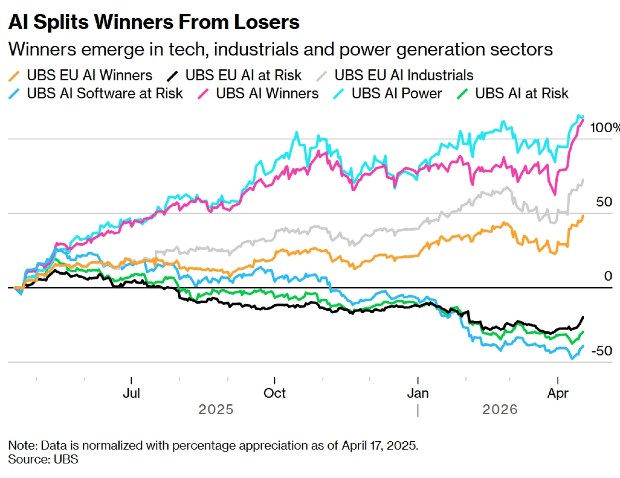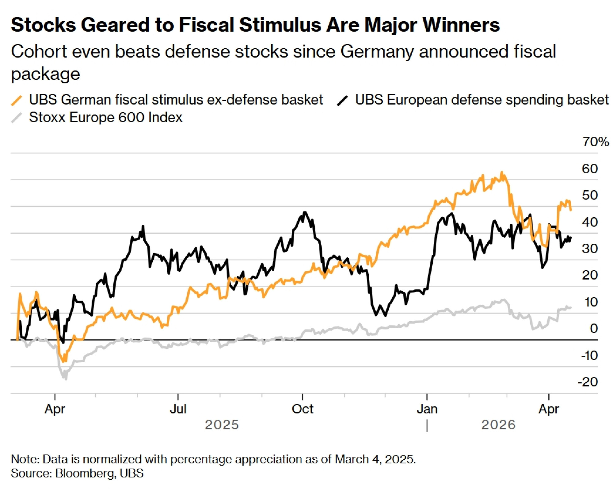 Košarica dionica UBS Group AG-a koja prati tvrtke izvan obrambenog sektora izložene rastućim državnim ulaganjima porasla je za gotovo 50 posto otkako je njemački plan poticaja dobio oblik u ožujku 2025. Istovremeno, ulaganja EU-a u zelenu energiju i kritičnu infrastrukturu potaknula su rast od otprilike 75 posto u košarici dionica obnovljivih izvora energije banke Goldman Sachs Group Inc.
