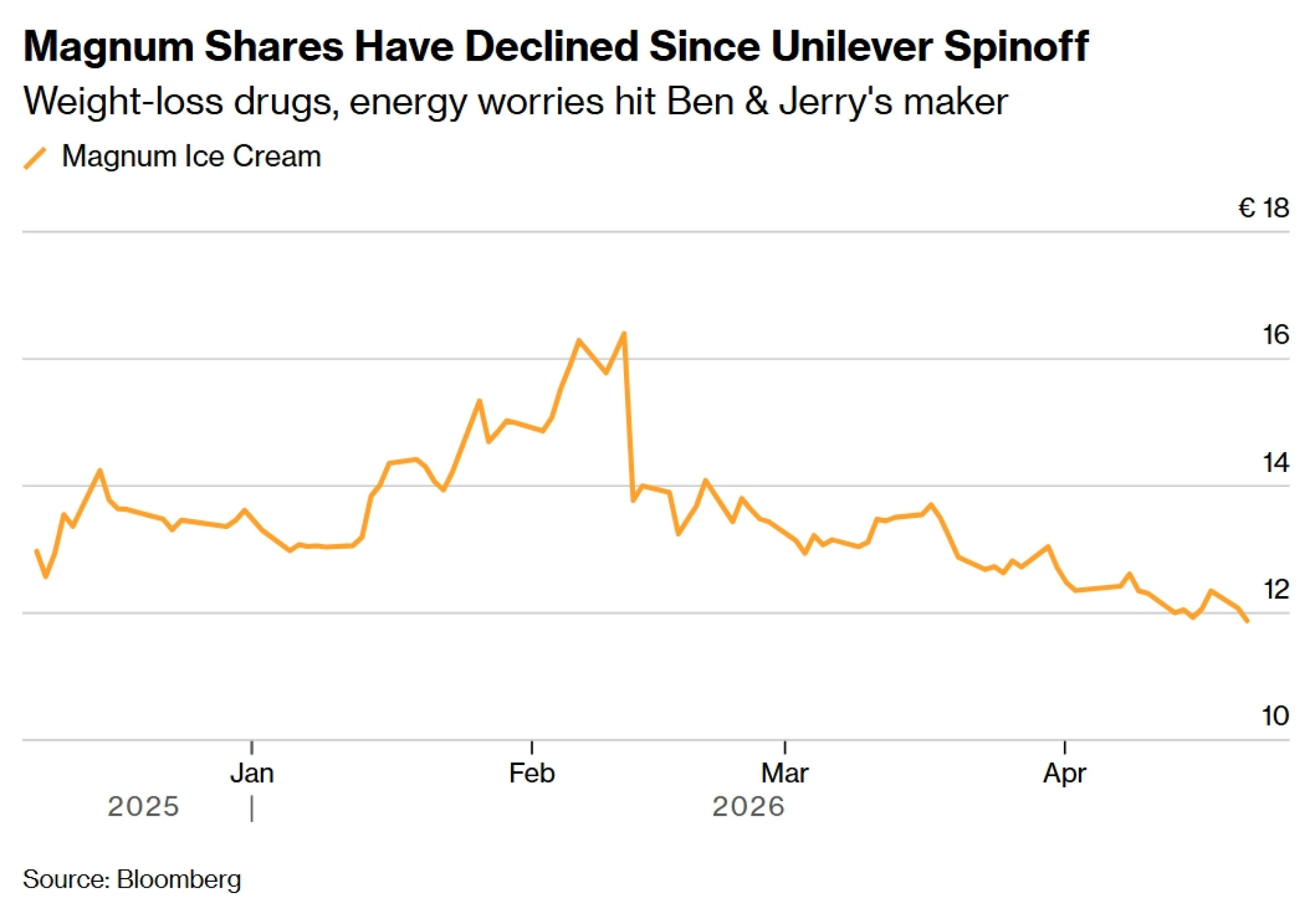 Magnum, najveća svjetska kompanija za proizvodnju sladoleda, nije uspjela privući investitore otkako se krajem prošle godine odvojila od tvrtke Unilever Plc. Cijena dionice pala je za 14 posto u 2026. godini, dok analitičari izražavaju zabrinutost da će sve veći broj ljudi koji uzimaju GLP-1 lijekove za mršavljenje smanjiti prodaju visokokaloričnih slastica.