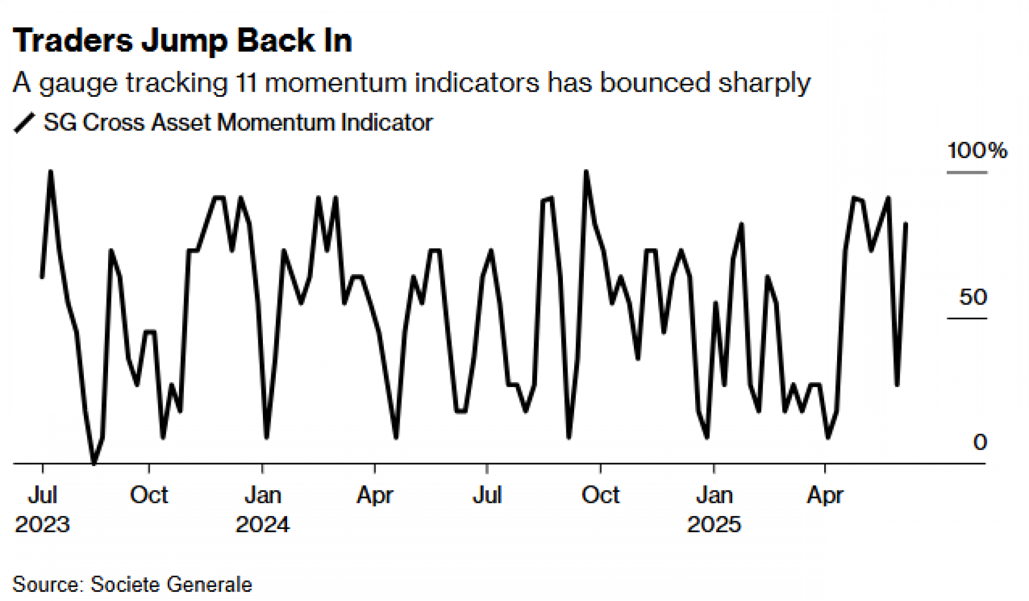 Indeks tvrtke Societe Generale koji prati momentum preko različitih klasa imovine ovaj je mjesec ostvario jedan od najdramatičnijih preokreta u povijesti, s devet od jedanaest komponenti koje daju pozitivne signale. Trendovi u fiksnom dohotku, dionicama i valutama bili su svi u zelenom kad je sukob izbio. Takve promjene cijena teško je ignorirati, kaže Manish Kabra iz SocGen-a.
