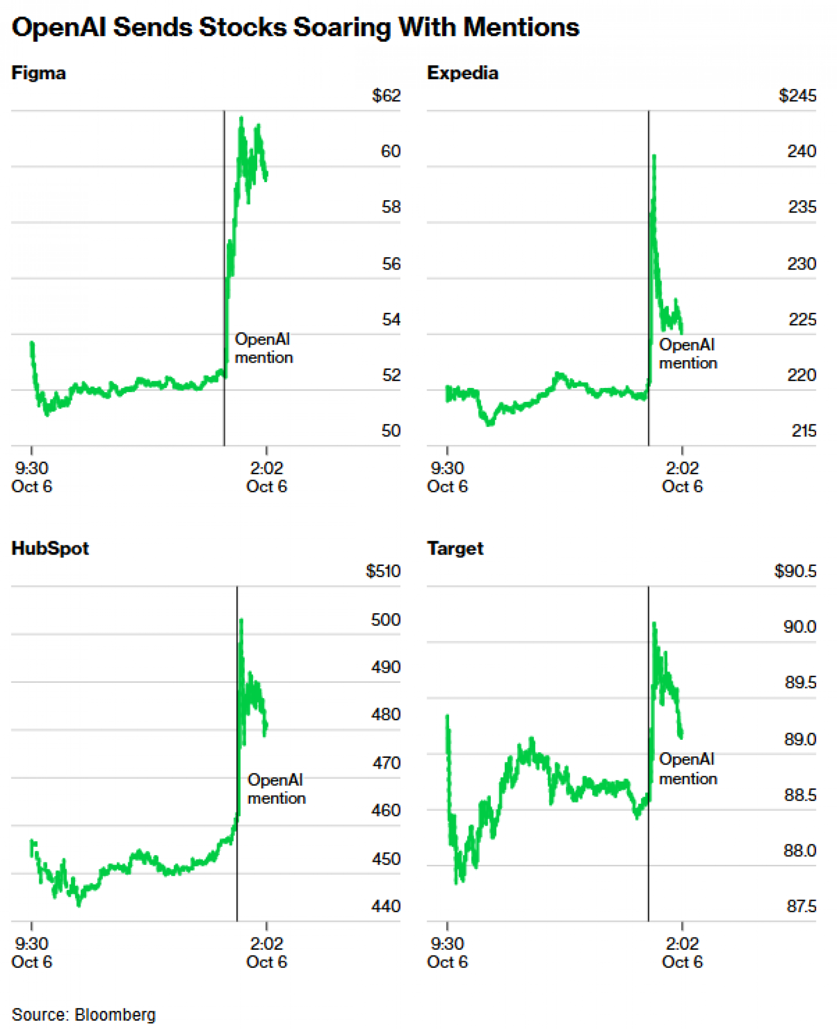 Tvrtka koja stoji iza ChatGPT-a održala je svoj godišnji skup za programere u ponedjeljak, a samo spominjanje drugih javno izlistanih tvrtki od strane njezinih izlagača potaknulo je snažan rast njihovih dionica. Među istaknutijima: Figma Inc. skočila je za 7,4 posto, HubSpot Inc. dodao je 2,6 posto, a Salesforce Inc. porastao je 2,3 posto. Internetske putničke kompanije također su nakratko ojačale - Expedia Group, Inc. i TripAdvisor Inc. porasle su za najmanje sedam posto prije nego što su dio dobitaka izgubile. Čak su i dionice proizvođača igračaka Mattel Inc. skočile gotovo šest posto, iako su na kraju dana završile gotovo nepromijenjene.