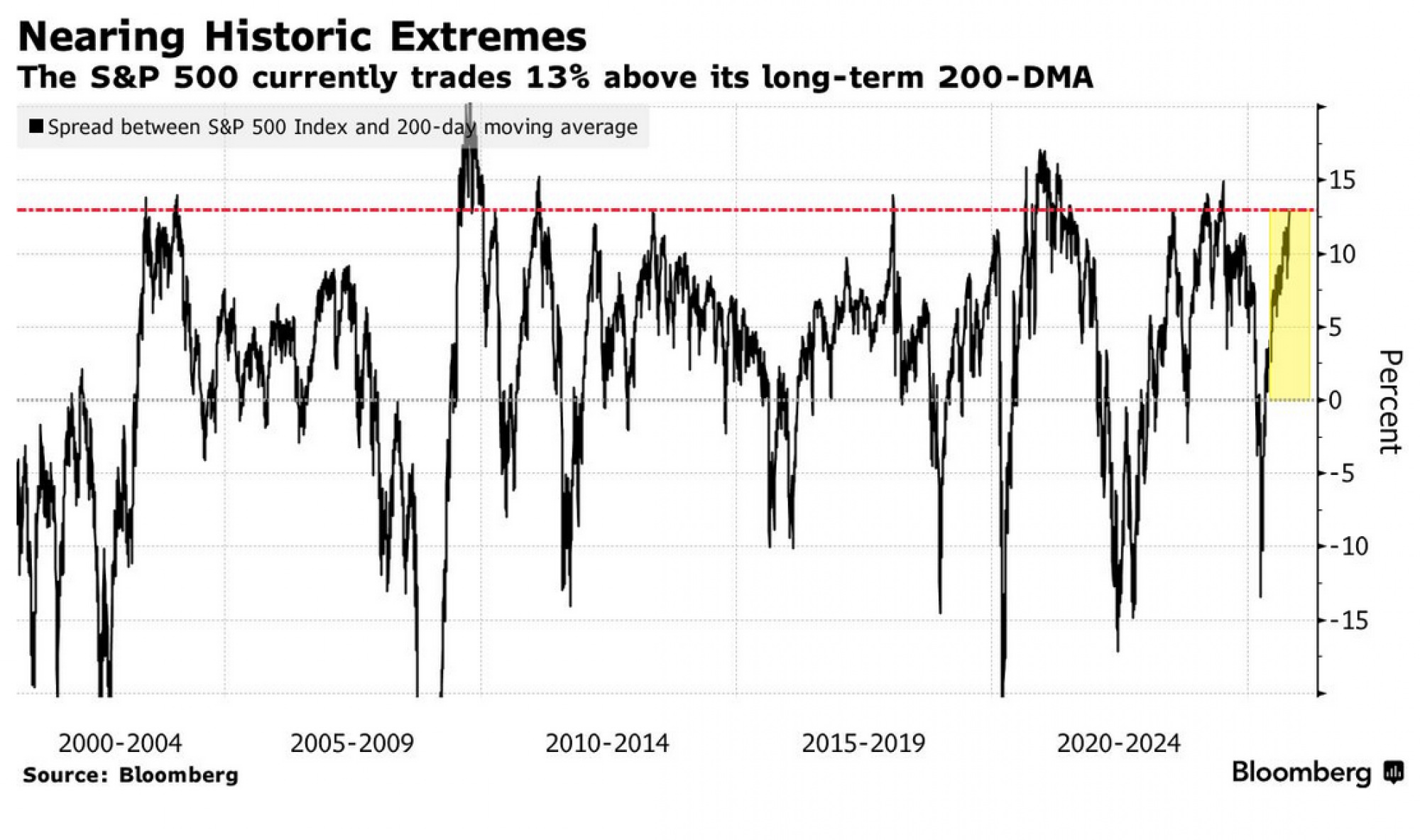 Raste zabrinutost zbog procjena vrijednosti velikih tehnoloških tvrtki u vrijeme kada se još jedan ključni tehnički pokazatelj na američkom tržištu dionica - 200-dnevni pomični prosjek - čini rastegnutim dok se približava povijesnim ekstremima, trgujući se 13 posto iznad svoje dugoročne razine podrške od 6.097. Takav raspon povijesno je ukazivao na rasprodaju, što se dogodilo 2011., 2018. i 2021., pokazuju podaci Bloomberga.