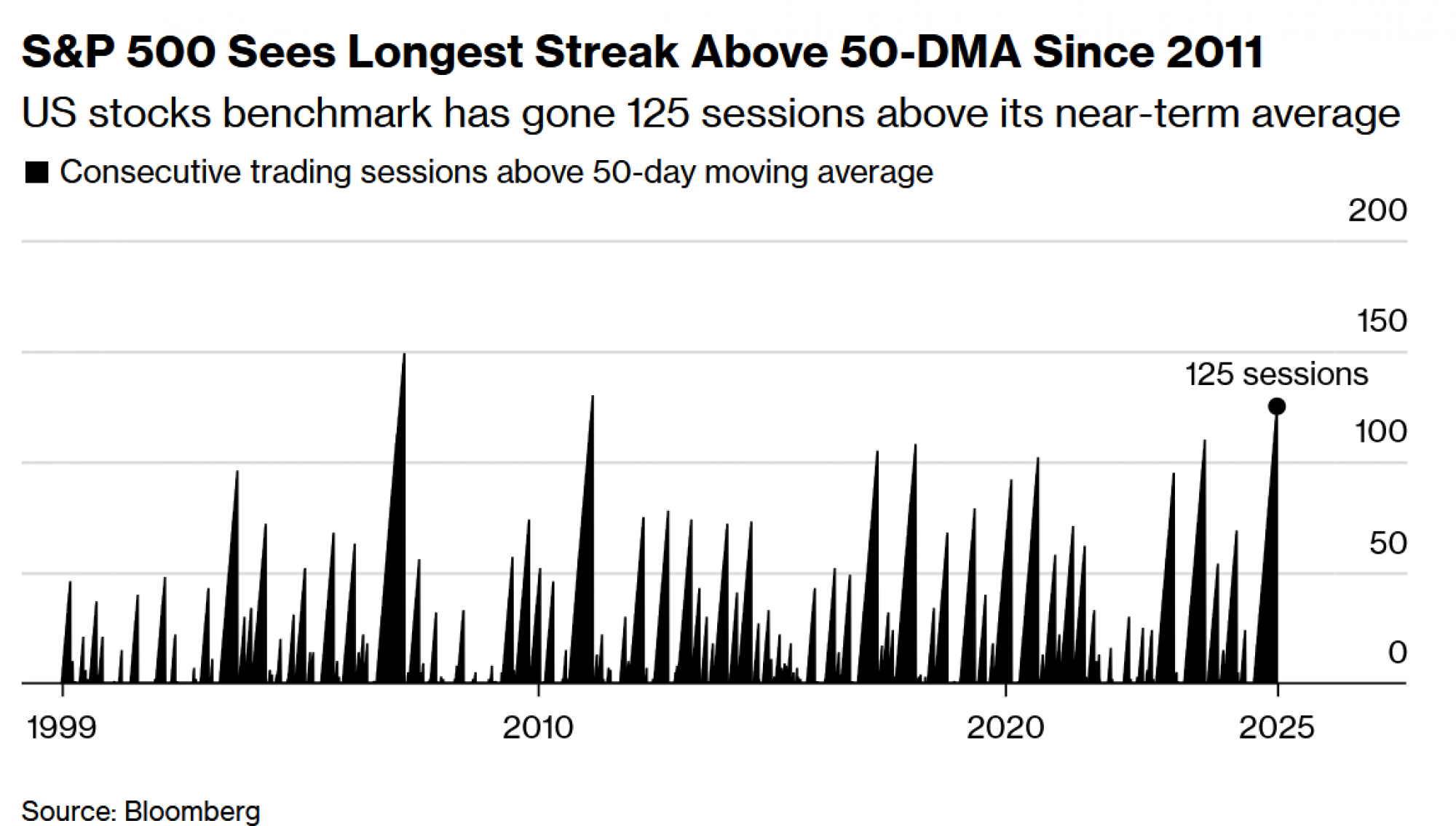 Indeks S&P 500 proveo je 125 sesija iznad svog 50-dnevnog pomičnog prosjeka, što je njegov najduži niz od 2011., pokazuju podaci koje je prikupio Bloomberg. Referentni indeks zabilježio je samo tri duža niza u posljednjih 30 godina.