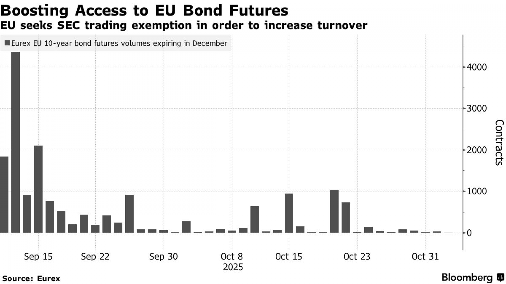 Ako uspije, to bi bilo prvo proširenje SEC-ovog popisa u desetljećima i moglo bi povećati obujam trgovine EU bond terminskim ugovorima, dok blok nastoji povećati likvidnost svoje zajedničke zaduženosti. Eurex je lansirao svoje ugovore u rujnu, iako obujam trgovine još uvijek čini tek djelić onoga što se vidi na dugo uspostavljenim tržištima francuskih, talijanskih i njemačkih obveznica.