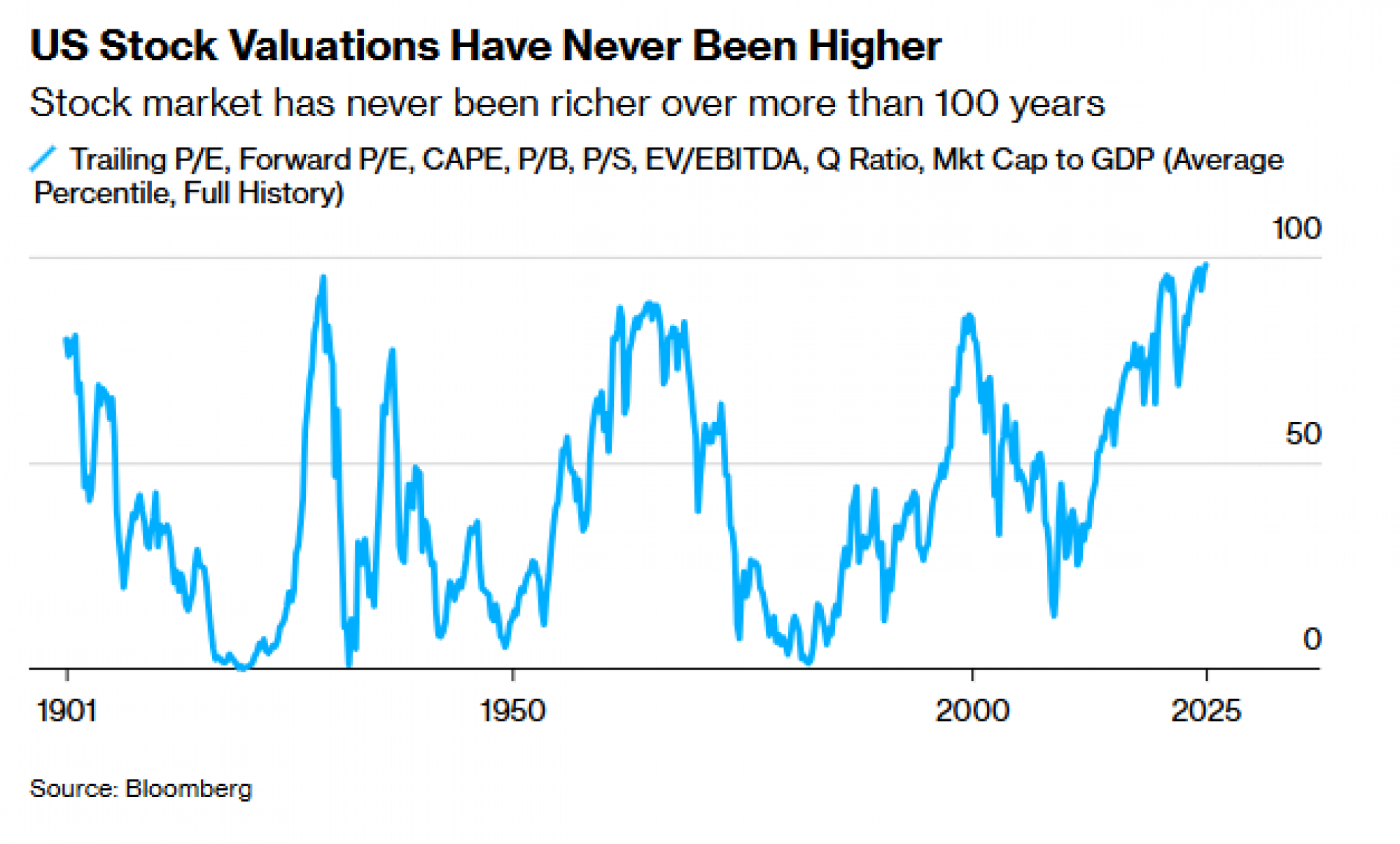 Pad bi mogao biti strm. Valuacije ne govore kada će tržište pasti, ali mogu dobro naznačiti koliko bi pad mogao biti dubok. Kombinirani prosjek nekoliko pokazatelja valuacije američkog tržišta dionica trenutačno je na rekordnoj razini, prema podacima koji se prate više od sto godina. Ako bi tržište palo 30 do 50 posto - kao što se dogodilo i u prijašnjim razdobljima ekstremno visokih valuacija - to ne ulijeva mnogo povjerenja onima koji danas ulažu u dionice.