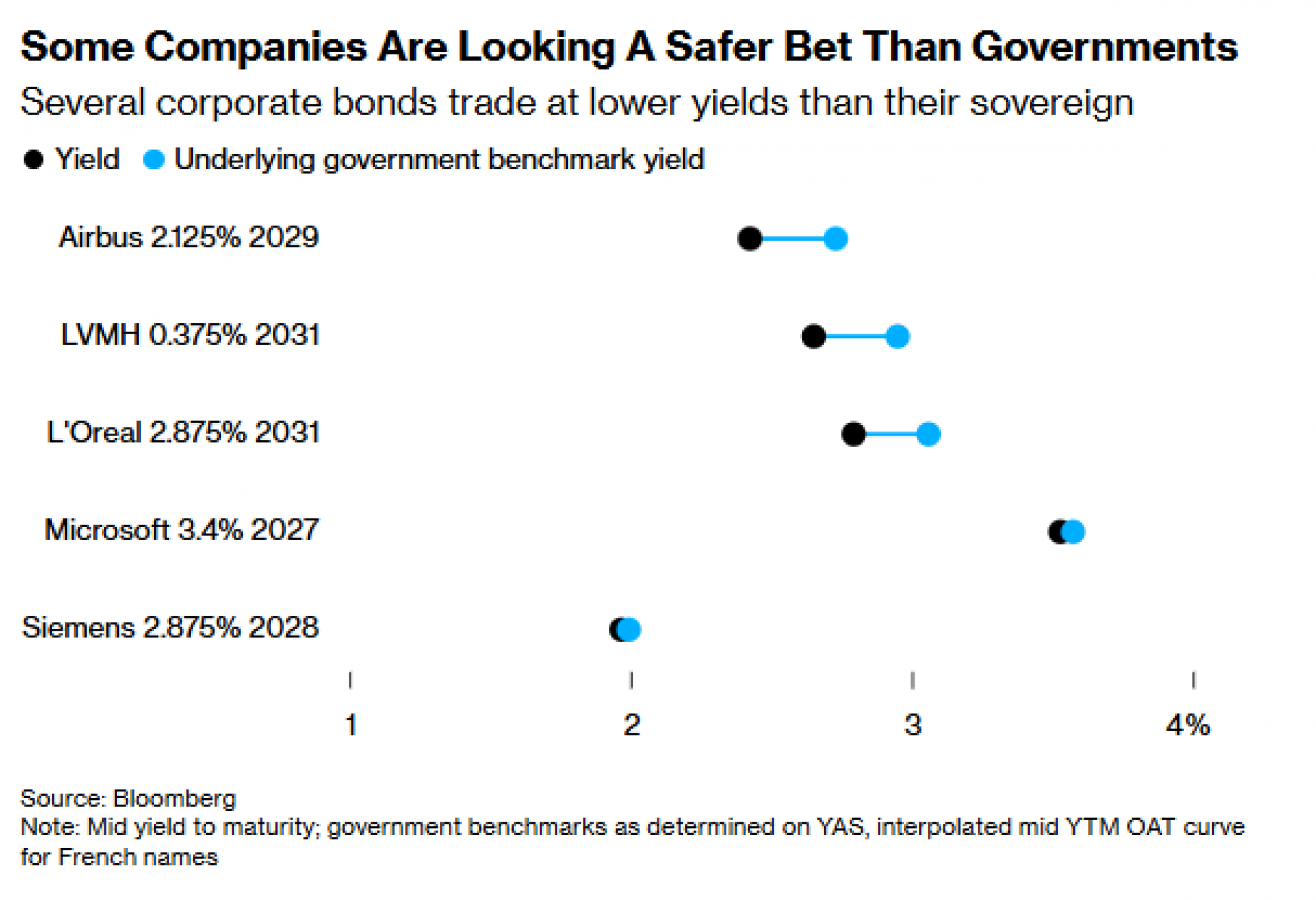 Na globalnom tržištu obveznica vrijednom 150 bilijuna dolara, ulagači sve češće zaključuju da su neke kompanije sigurnija oklada čak i od najmoćnijih vlada.