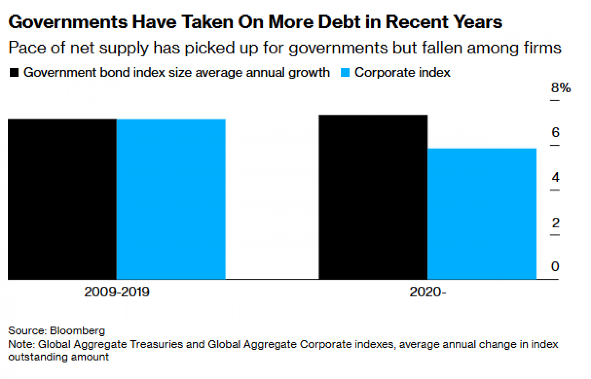 U deset godina nakon globalne financijske krize, neto ponuda - novi dug minus otplaćene obveznice - rasla je sličnim tempom kod vlada i kompanija, prema podacima Bloomberga. No, od 2020. izdavanje državnog duga snažno je poraslo jer su vlade uvele skupe politike za poticanje gospodarstva tijekom pandemijskih zatvaranja.