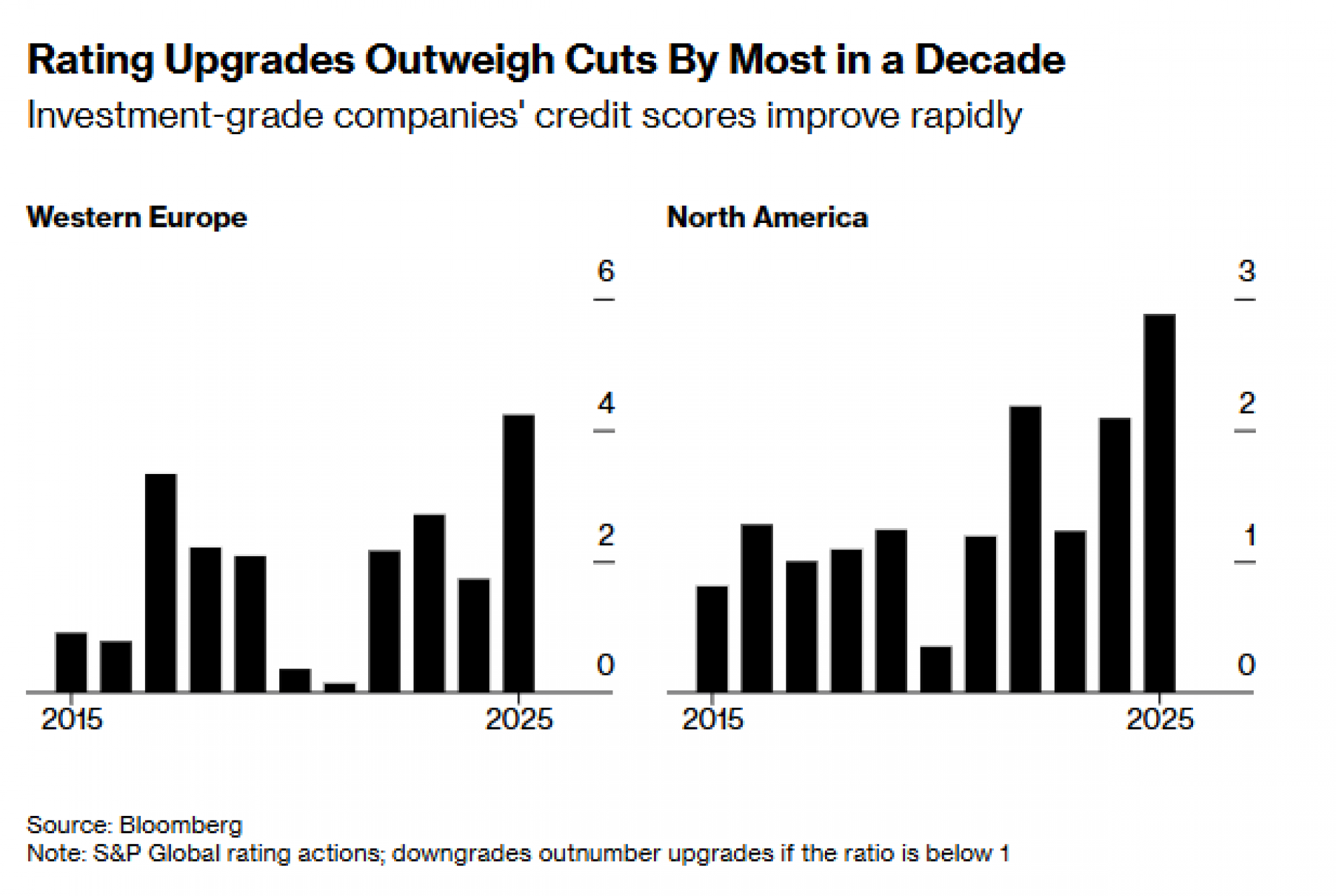 To se odrazilo i na kreditne rejtinge: SAD i Francuska suočile su se s nedavnim sniženjima kreditnog rejtinga, dok se kompanijama u Sjevernoj Americi i zapadnoj Europi rejting poboljšava najbržim tempom u deset godina.