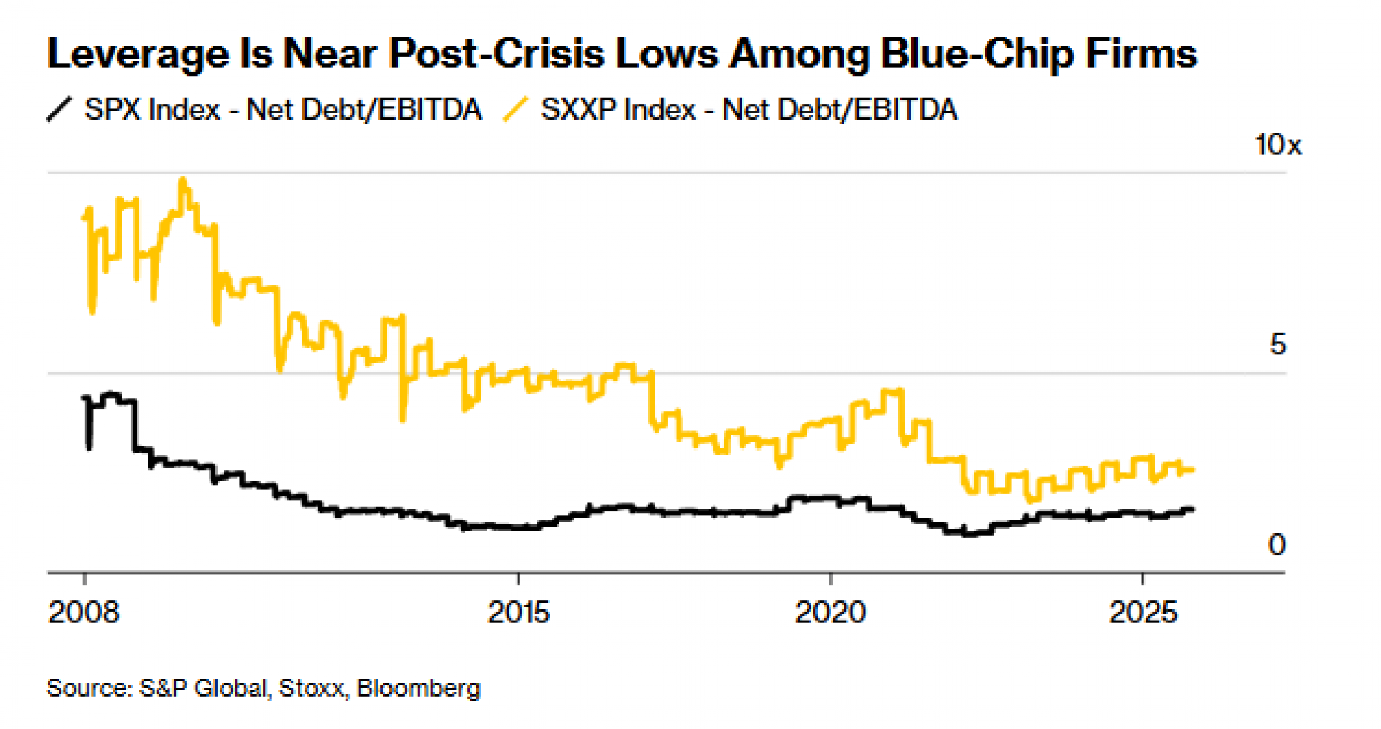 Ključna mjera kreditne sposobnosti kompanija - omjer neto duga i dobiti prije kamata, poreza i amortizacije (EBITDA) -zadržala se blizu najnižih razina od financijske krize, unatoč višim troškovima zaduživanja. Za oko 2500 kompanija u MSCI ACWI indeksu, taj omjer se u prvoj polovici ove godine poboljšao na prosječnih 1,74 puta, u usporedbi s prosjekom od 2,53 prije deset godina, prema podacima Bloomberga. Niža vrijednost znači snažniju bilancu.