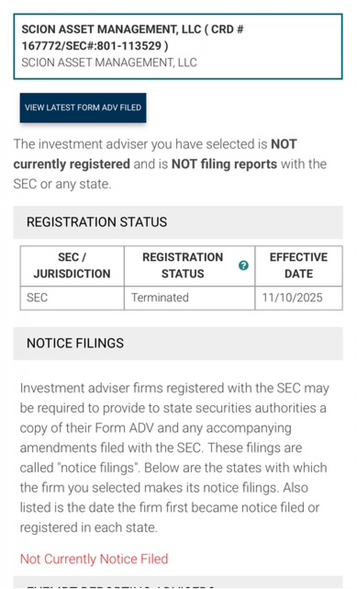 Dokument SEC-a pokazuje da je Scion fond Michaela Burryja deregistriran
