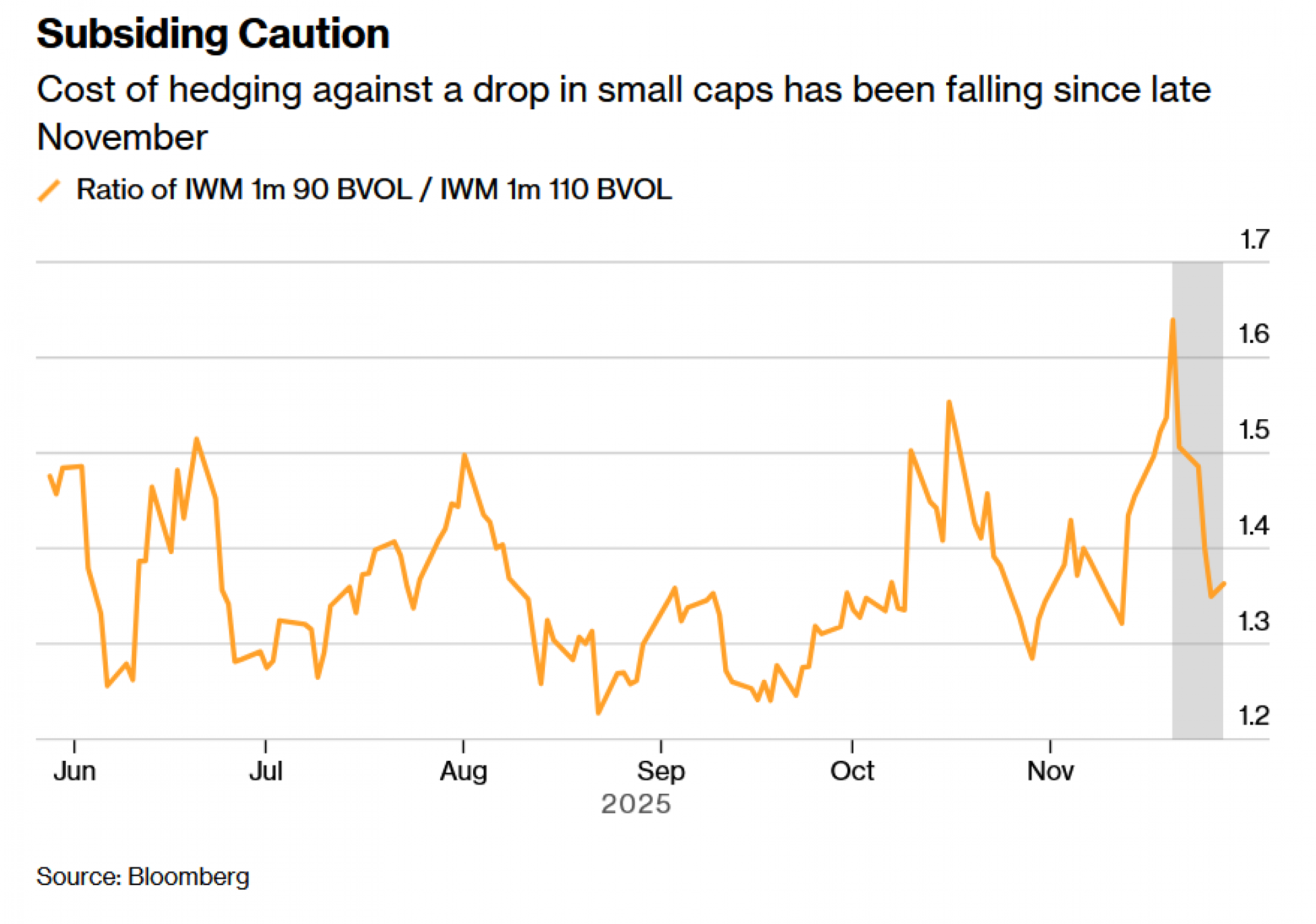 Za sada, smanjena potražnja za zaštitom od daljnjeg pada indeksa Russell 2000 održava takozvani "call skew" - mjeru relativnog troška optimističnijih opcija - niskim, što daje investitorima priliku da se klade na rast small-cap dionica.