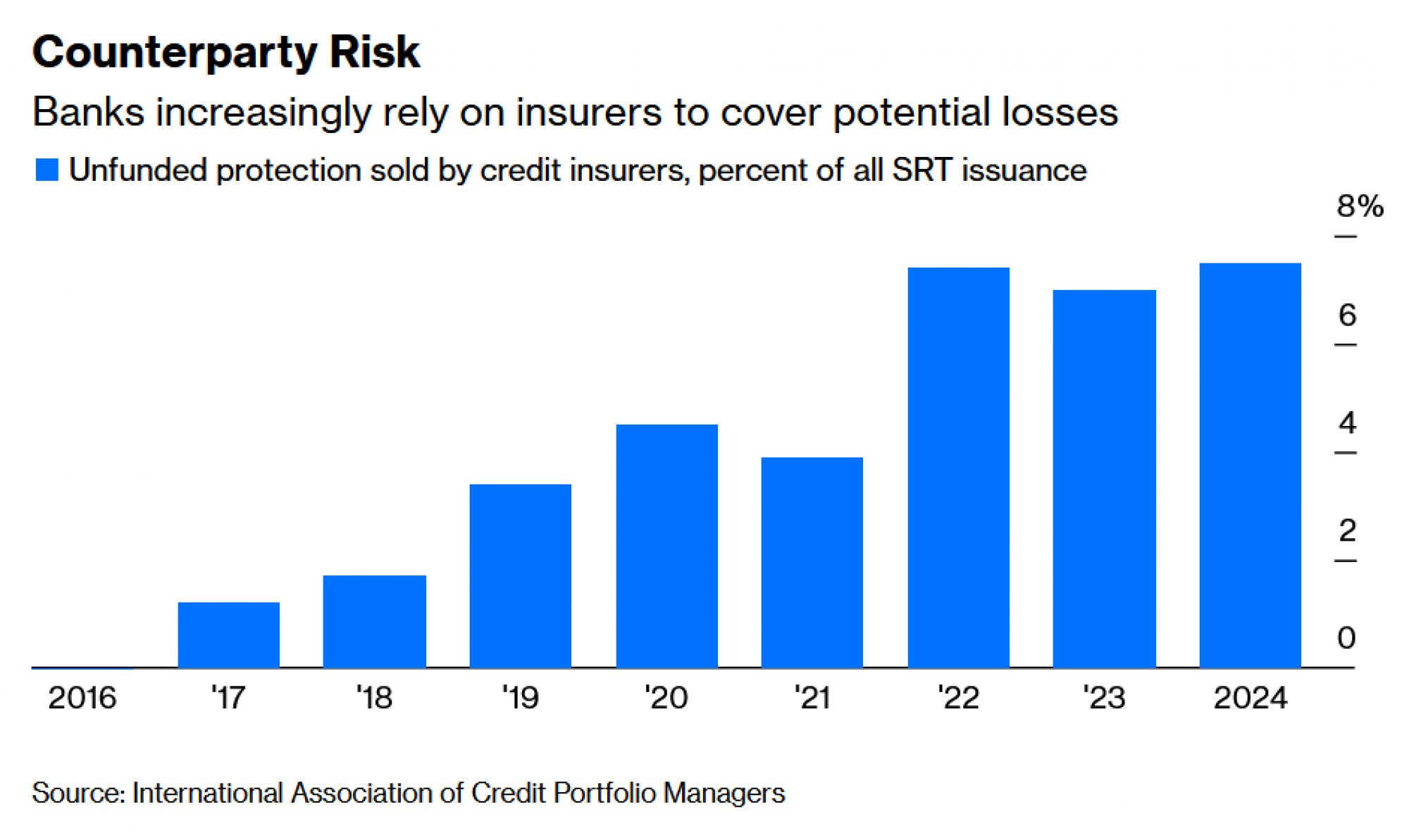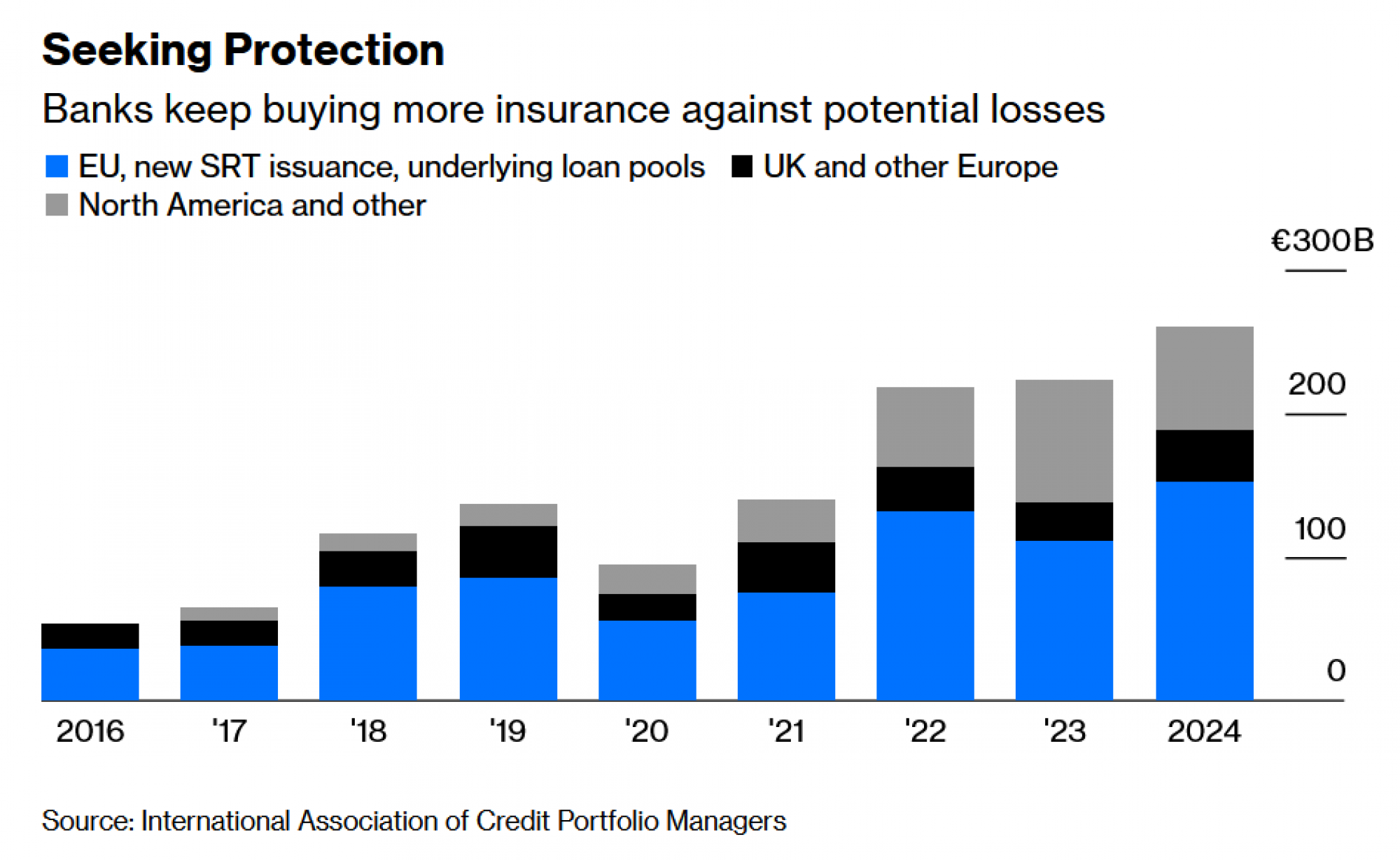 Takvi postupci, poznati kao synthetic risk transfers (SRT), sve su češći. Njihov godišnji volumen otprilike se upeterostručio od 2016., makar s male početne razine. Povezana imovina u bilancama banaka (koja može uključivati sve od hipoteka do zajmova private equity fondovima) iznosila je više od 670 milijardi dolara na kraju 2024., prema podacima koje je prikupio Bloomberg.