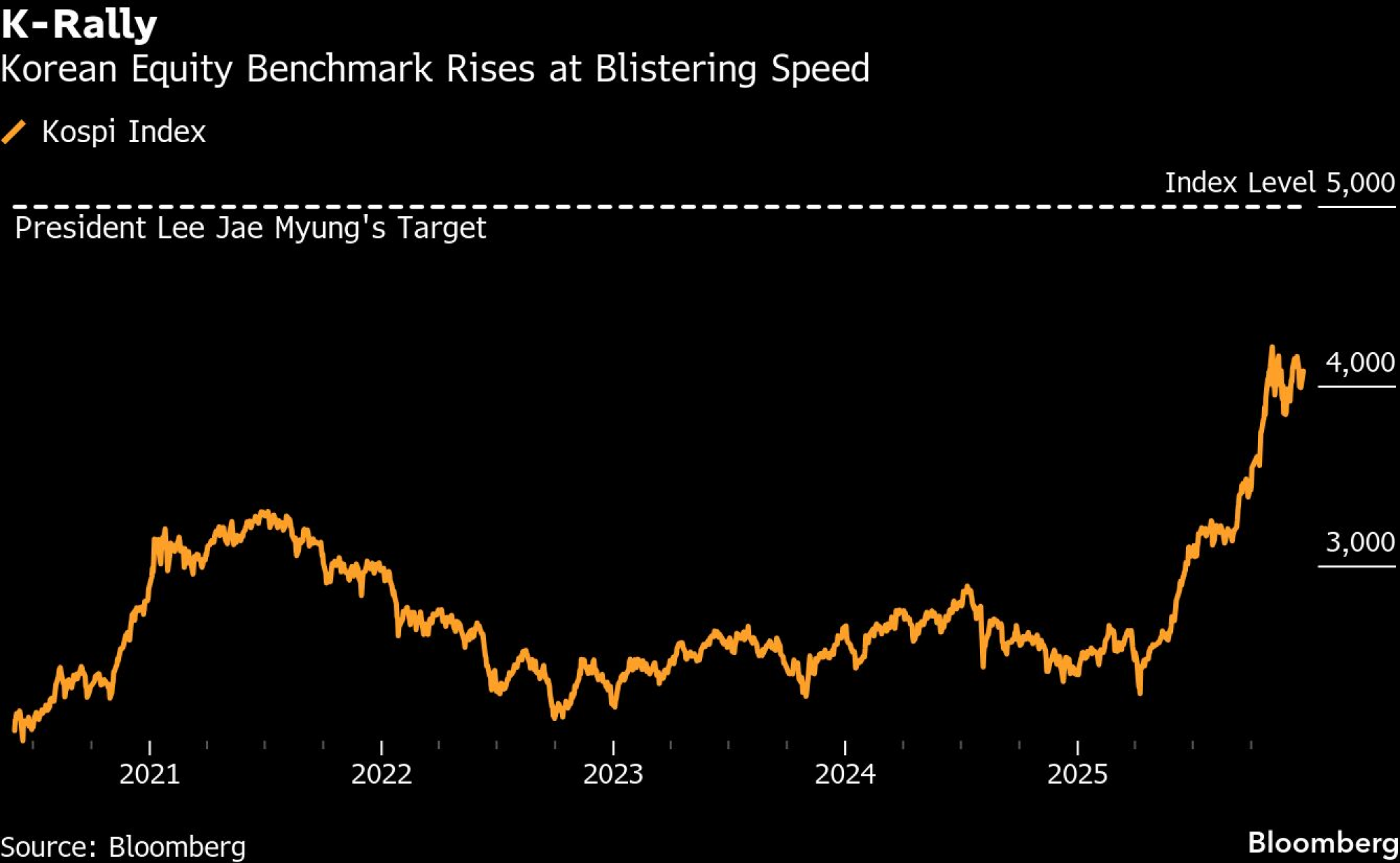 Rijetko se viđa da politički lider javno postavi razinu indeksa kao cilj, a Leejeva kampanja "Kospi 5.000" u početku je prošla gotovo nezapaženo. Sada sve više banaka s Wall Streeta, uključujući JPMorgan Chase & Co. i Citigroup Inc., smatraju da je ta razina dostižna u 2026. godini, dijelom zahvaljujući svjetskom procvatu AI-a, koji je povećao potražnju za korejskim dionicama koje se smatraju glavnom azijskom investicijom na polju AI-a.