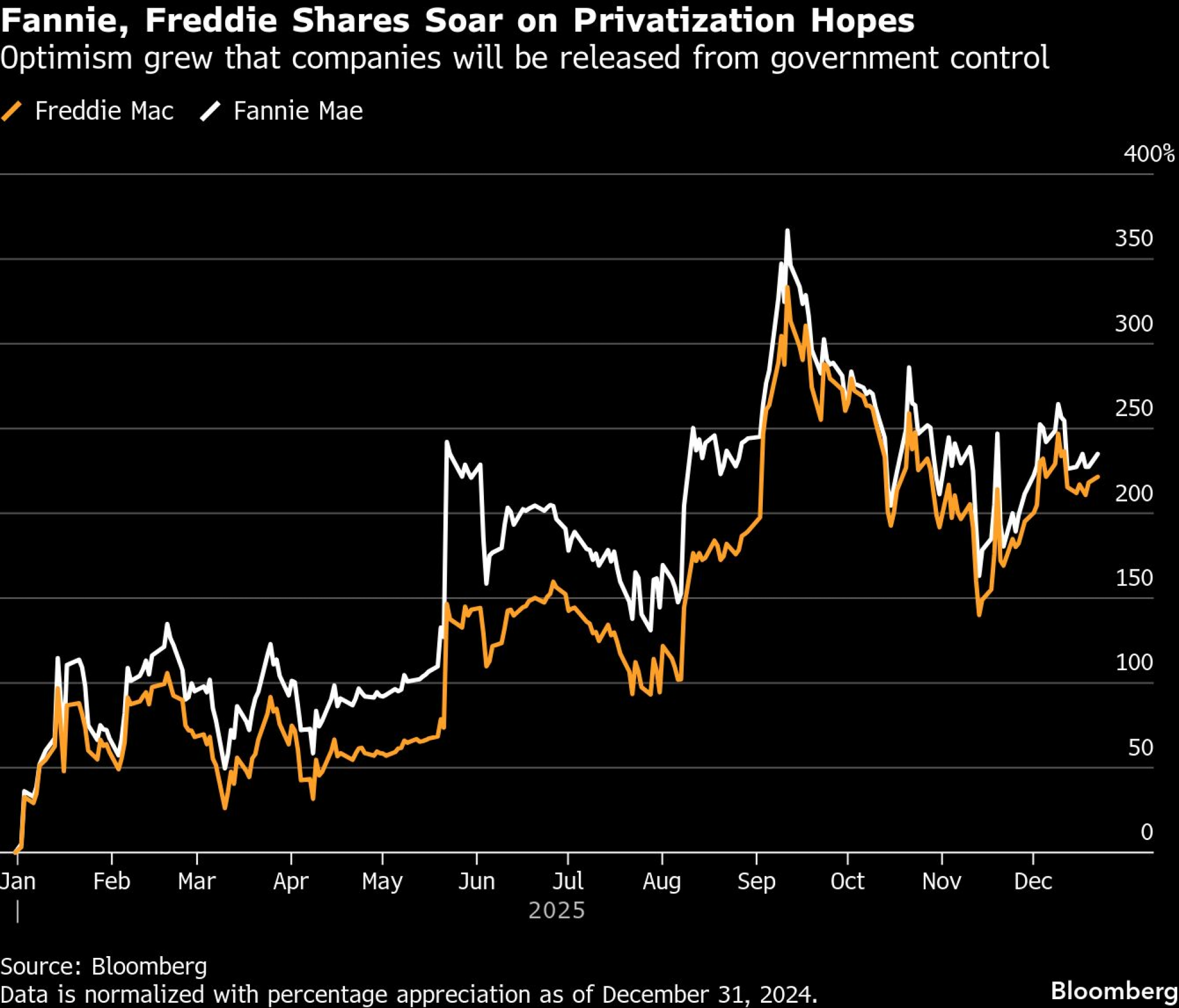 Fannie Mae i Freddie Mac, divovi u financiranju hipotekarnih kredita koji su pod kontrolom Washingtona još od financijske krize, godinama su predmet nagađanja o tome kada i kako bi mogli biti oslobođeni državnog nadzora. Pristaše te ideje, poput upravitelja hedge fonda Billa Ackmana, gomilali su dionice u nadi da će profitirati od bilo kakvog plana privatizacije, ali su se te dionice godinama vukle u trgovanju izvan burze dok je status quo opstajao.