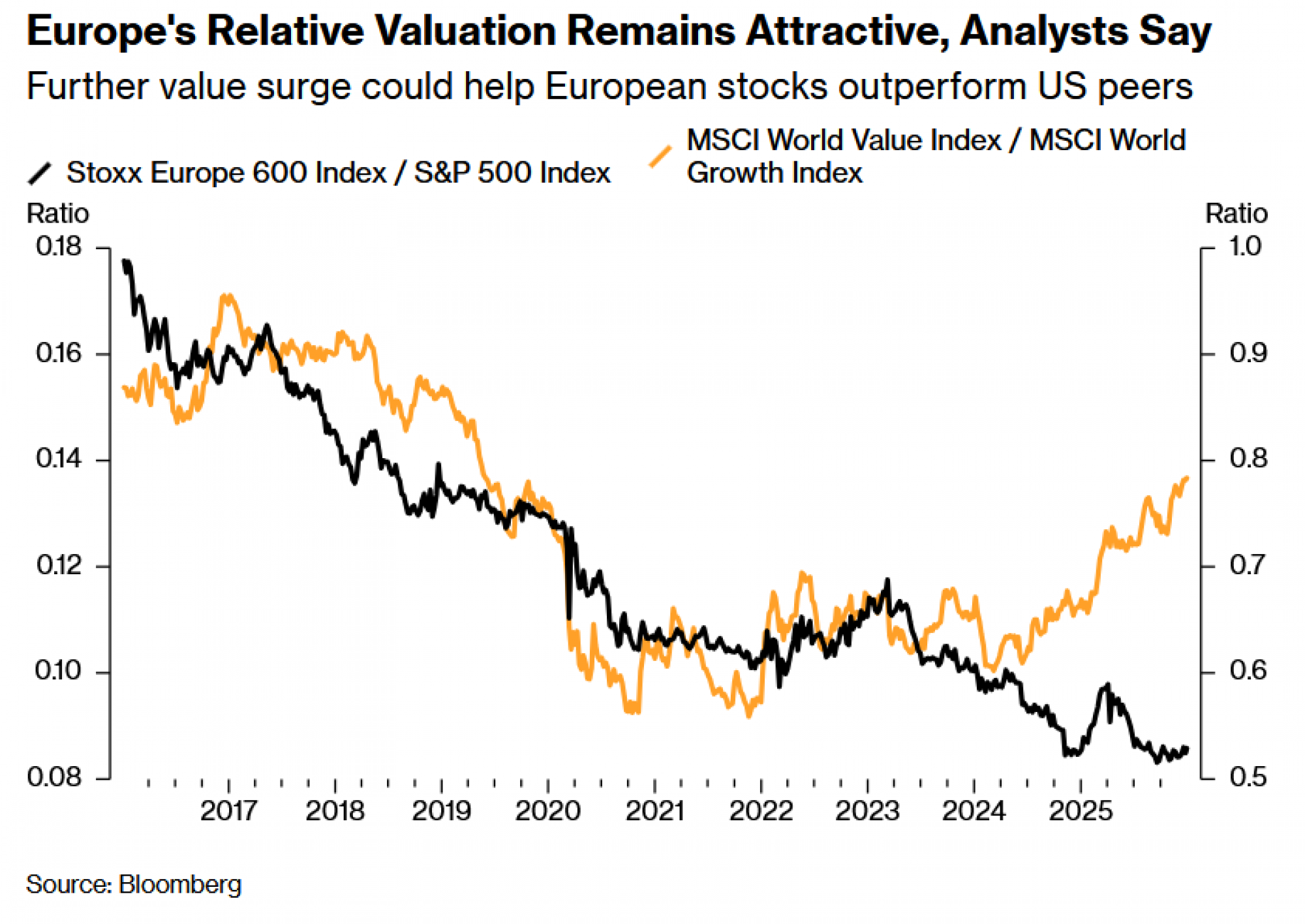Europske dionice vjerojatno će rasti na krilima "šireg oporavka SAD-a" u 2026. godini, prema stratezima predvođenim Marinom Zavolock. S obzirom na to da SAD čini oko 23 posto ponderiranih prihoda, europske tvrtke mogle bi imati koristi od rasta američke zarade iznad tržišnog konsenzusa, uz povoljne porezne i regulatorne politike.