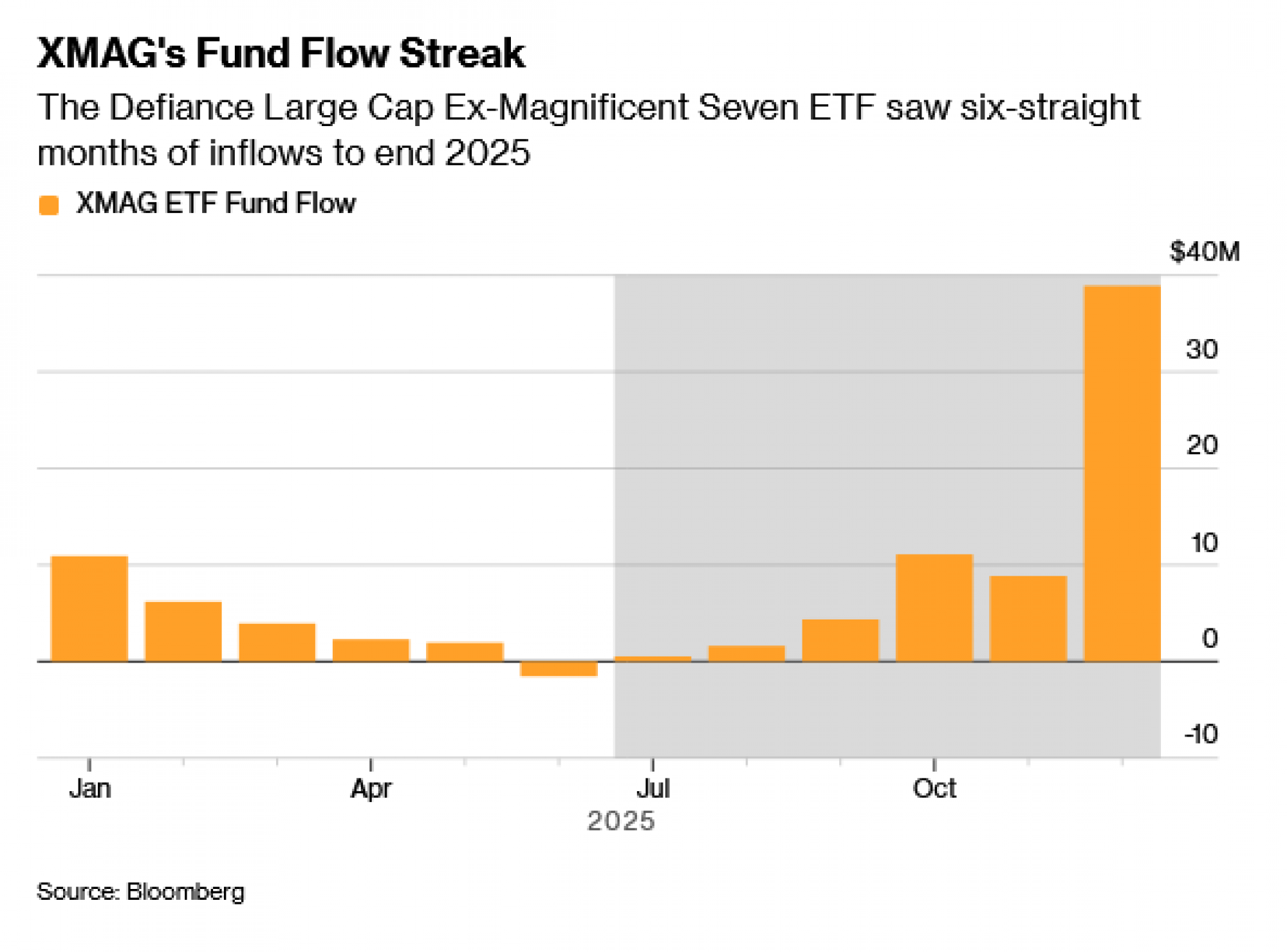 Na tržištu je zabilježeno povlačenje iz dionica čiji se rast temelji na momentumu u defenzivnije i cjenovno pristupačnije sektore. Defiance Large Cap Ex-Magnificent Seven ETF, koji je pokrenut krajem 2024. godine, zabilježio je šest uzastopnih mjeseci priljeva do kraja prošle godine, uključujući učetverostručenje u prosincu u odnosu na razinu iz studenog. Taj ETF, oznake XMAG, porastao je prošle godine za 15 posto, a većina rasta ostvarena je u posljednjih šest mjeseci.