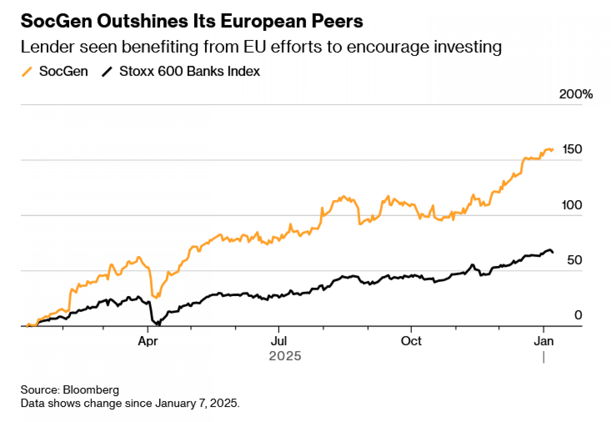 SocGen je porastao za 159 posto u posljednjih 12 mjeseci, nadmašivši sve ostale članove indeksa Stoxx 600 Banks, koji je u tom razdoblju porastao za 67 posto.
