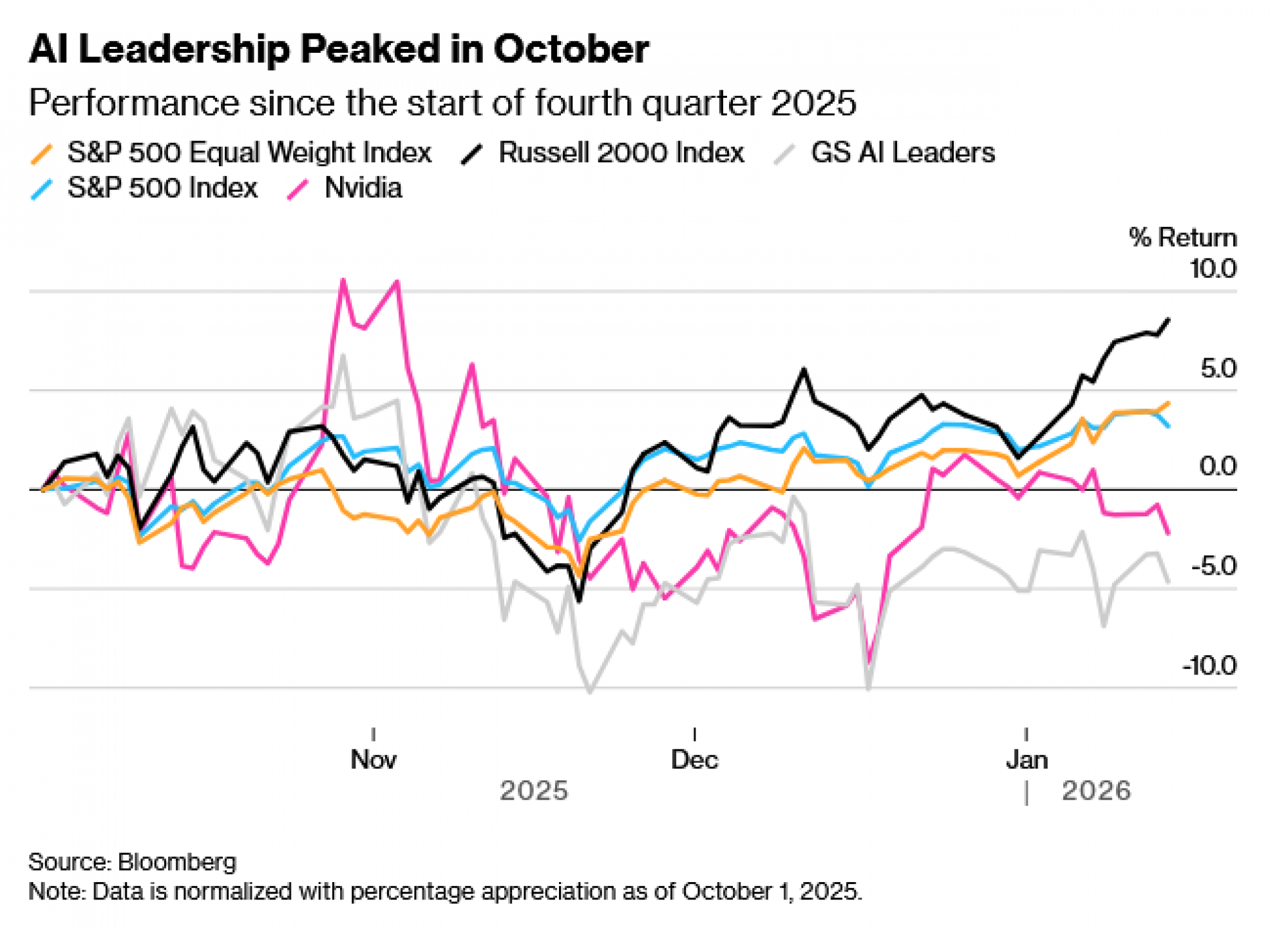 Obnovljeni optimizam o umjetnoj inteligenciji u četvrtak slijedi nakon višetjednog trenda stabilnog udaljavanja od dionica tehnoloških tvrtki s velikom tržišnom kapitalizacijom, koje su dugo bile omiljene zbog svoje otporne zarade tijekom ekonomske neizvjesnosti, prema širem skupu tvrtki koje profitiraju od poboljšanih izgleda rasta.