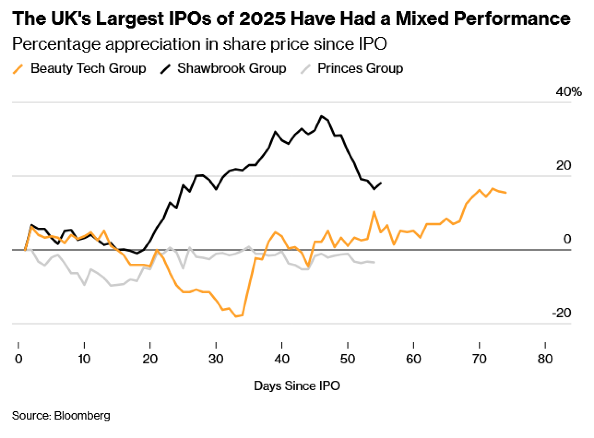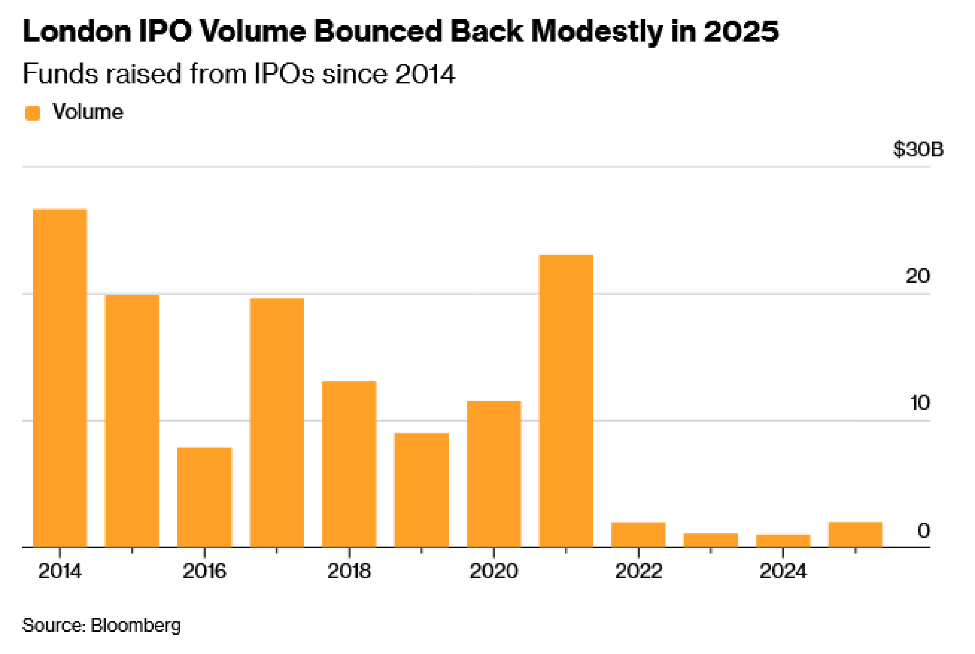 Stvari su počele izgledati bolje krajem prošle godine, kada je navala inicijalnih javnih ponuda pomogla povećati ukupan iznos prikupljen od tvrtki u Londonu na dvije milijarde dolara, dvostruko više od iznosa prikupljenog 2024. godine. Unatoč porastu, volumeni su i dalje bili daleko ispod povijesnih razina, prema podacima koje je prikupio Bloomberg.