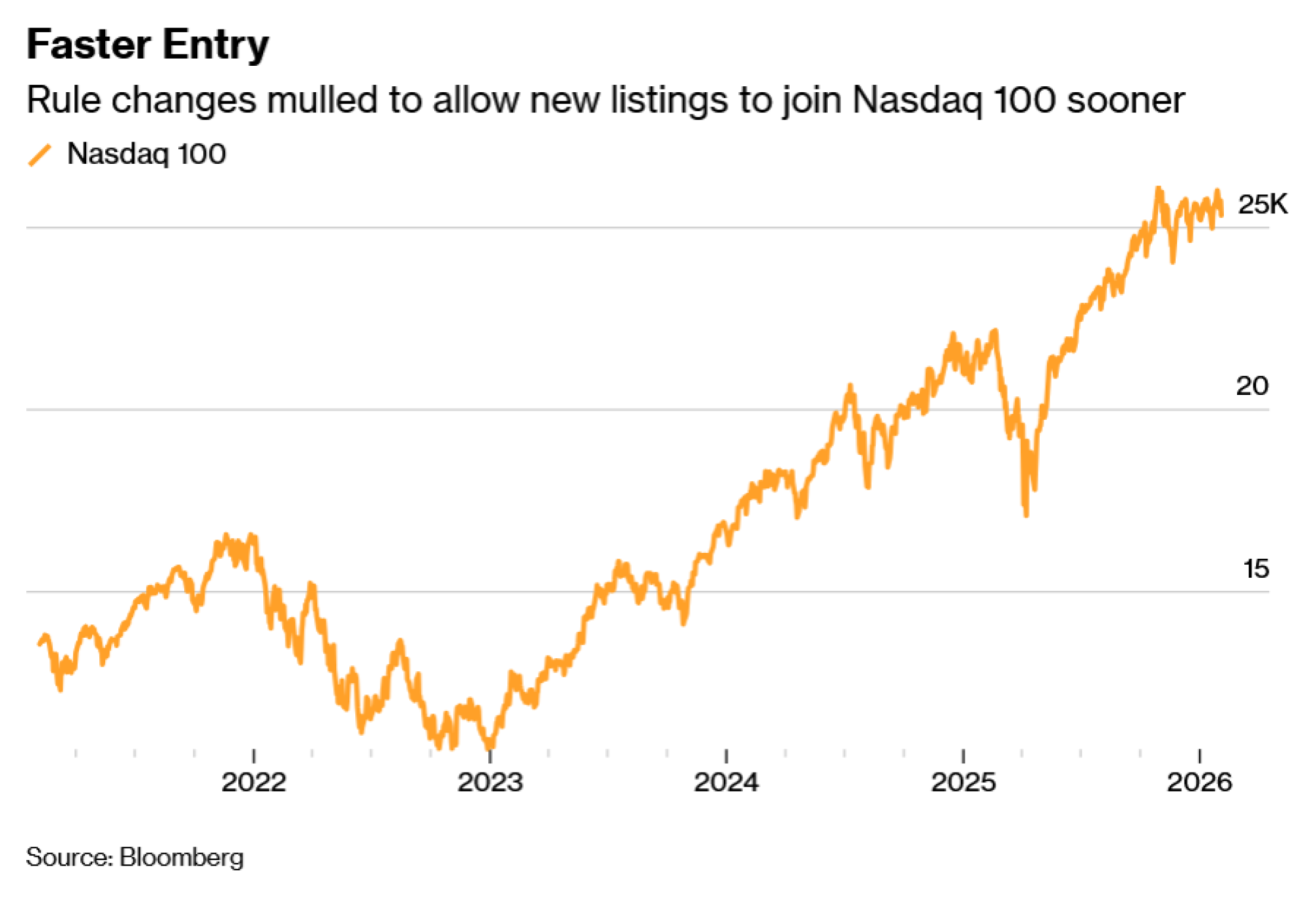 Planirana revizija (tzv. fast entry rule – pravilo brzog ulaska) omogućila bi novoizlistanim tvrtkama pridruživanje indeksu Nasdaq 100 već nakon prvih 15 dana trgovanja, objavio je Nasdaq. To je puno kraće od trenutnog razdoblja čekanja od najmanje tri mjeseca.