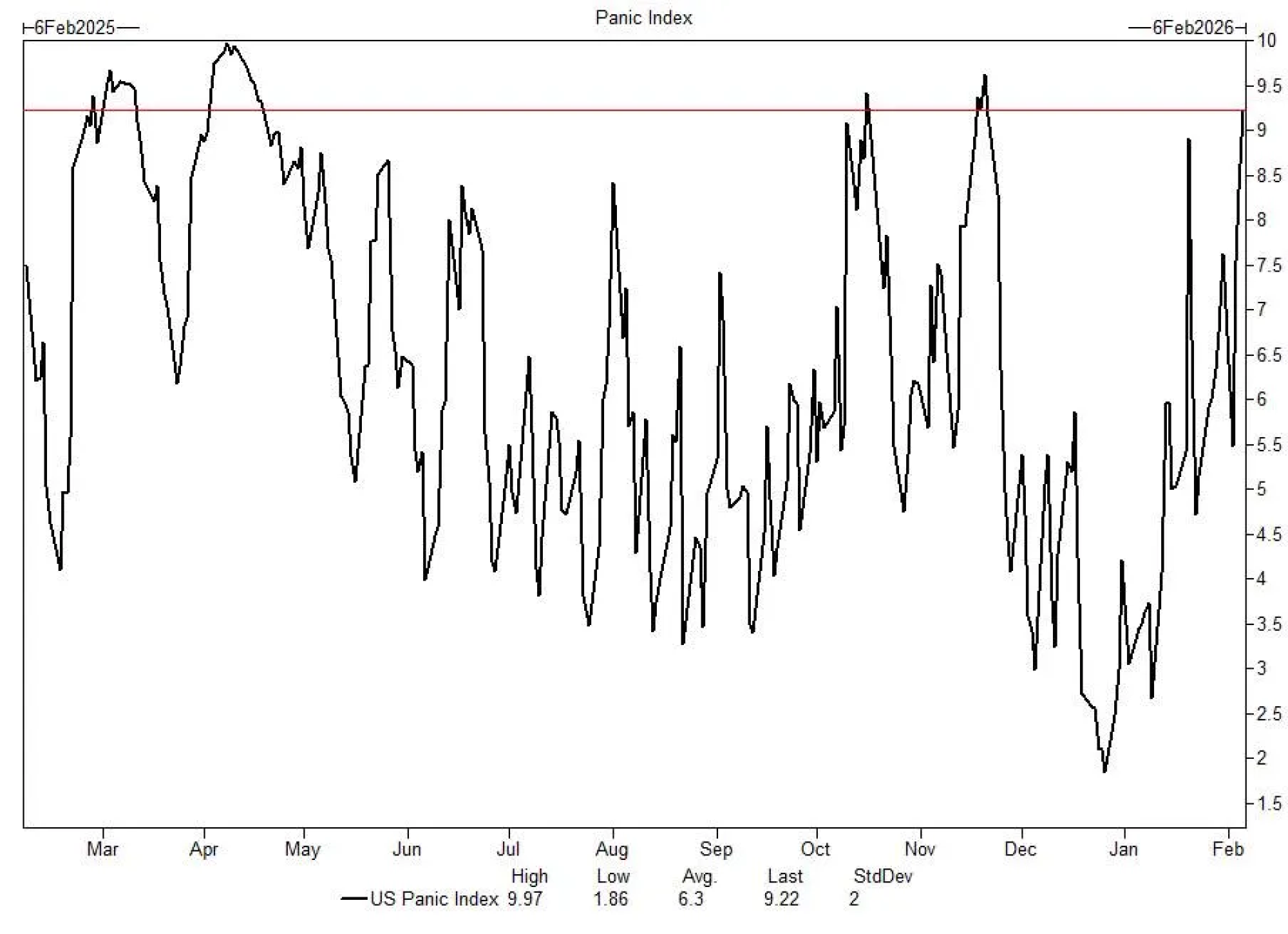 Stres investitora bio je visok prošli tjedan. Goldmanov indeks panike, koji kombinira jednomjesečnu impliciranu volatilnost S&P-a, volatilnost VIX-a, nagib mjesečnih put-call opcija S&P-a i nagib strukture vremenske volatilnosti S&P-a, nedavno je iznosio 9,22, što ukazuje na to da su tržišta u četvrtak bila blizu razine "maksimalnog straha".