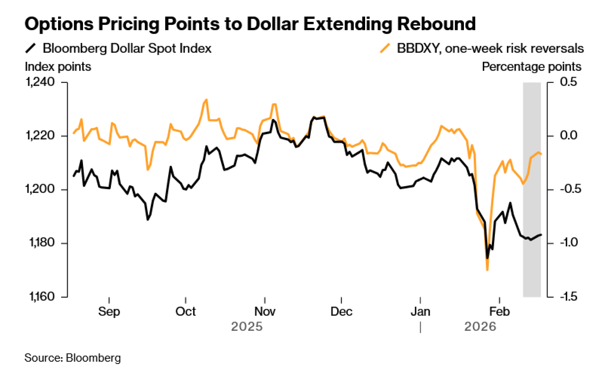 Bloombergov Dollar Spot Index porastao je za 0,1 posto, iako je jen ojačao za oko 0,4 posto, a pad vrijednosti ostalih valuta u košarici zadržao je indeks na višoj razini. Tržišta opcija ukazuju na to da je kratkoročni pesimizam prema dolaru oslabio, a tzv. front-end risk reversals su na najmanje negativnim razinama u gotovo mjesec dana.