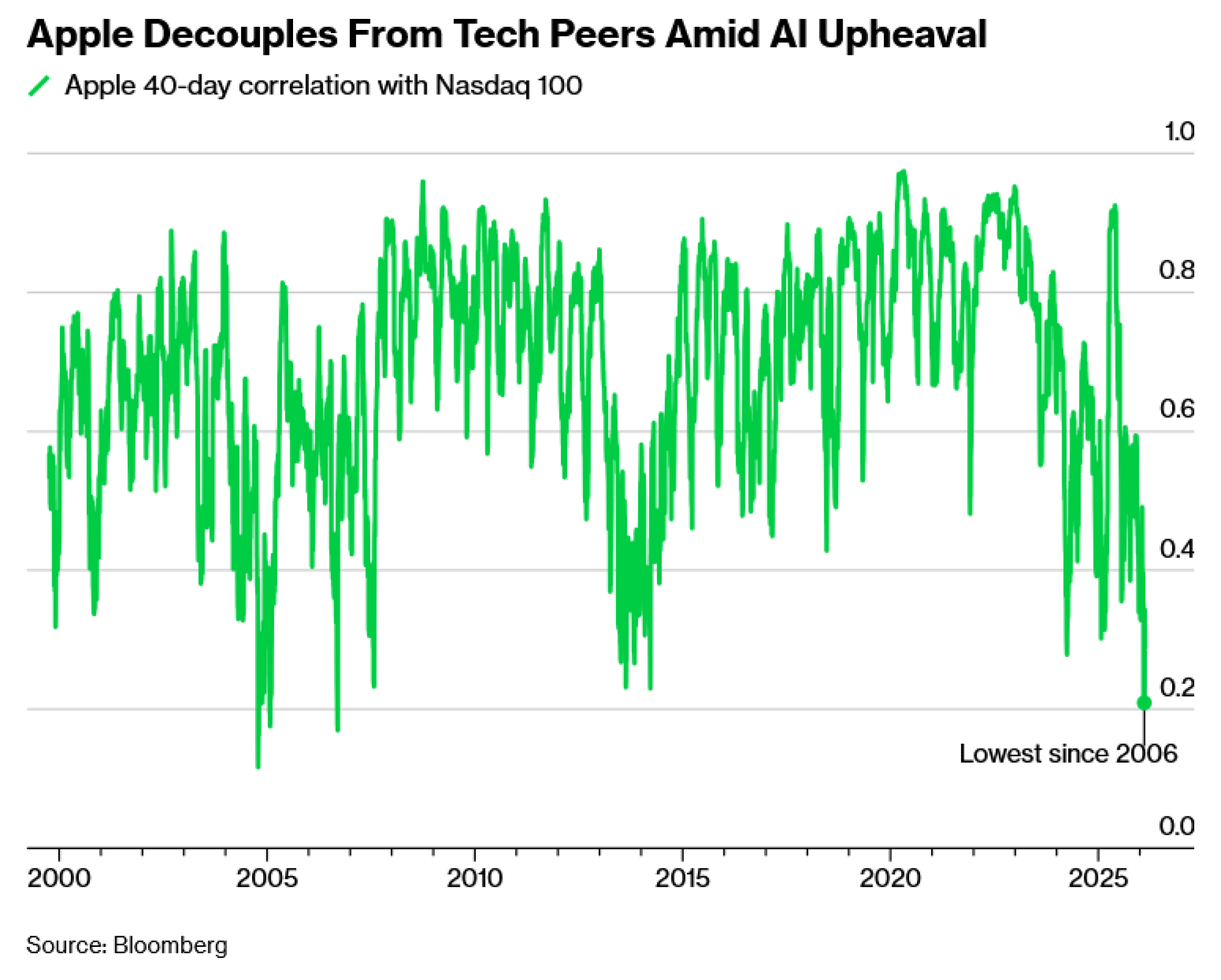 Appleova 40-dnevna korelacija s indeksom Nasdaq 100 pala je prošli tjedan na 0,21, najnižu razinu od 2006. godine, prema podacima koje je prikupio Bloomberg. Njegova korelacija s referentnom vrijednošću u padu je od svibnja, kada je dosegla 0,92. Appleova odluka da uglavnom ostane po strani u utrci razvoja umjetne inteligencije pretvorila ga je u iznimku u usporedbi s mnogim konkurentima.