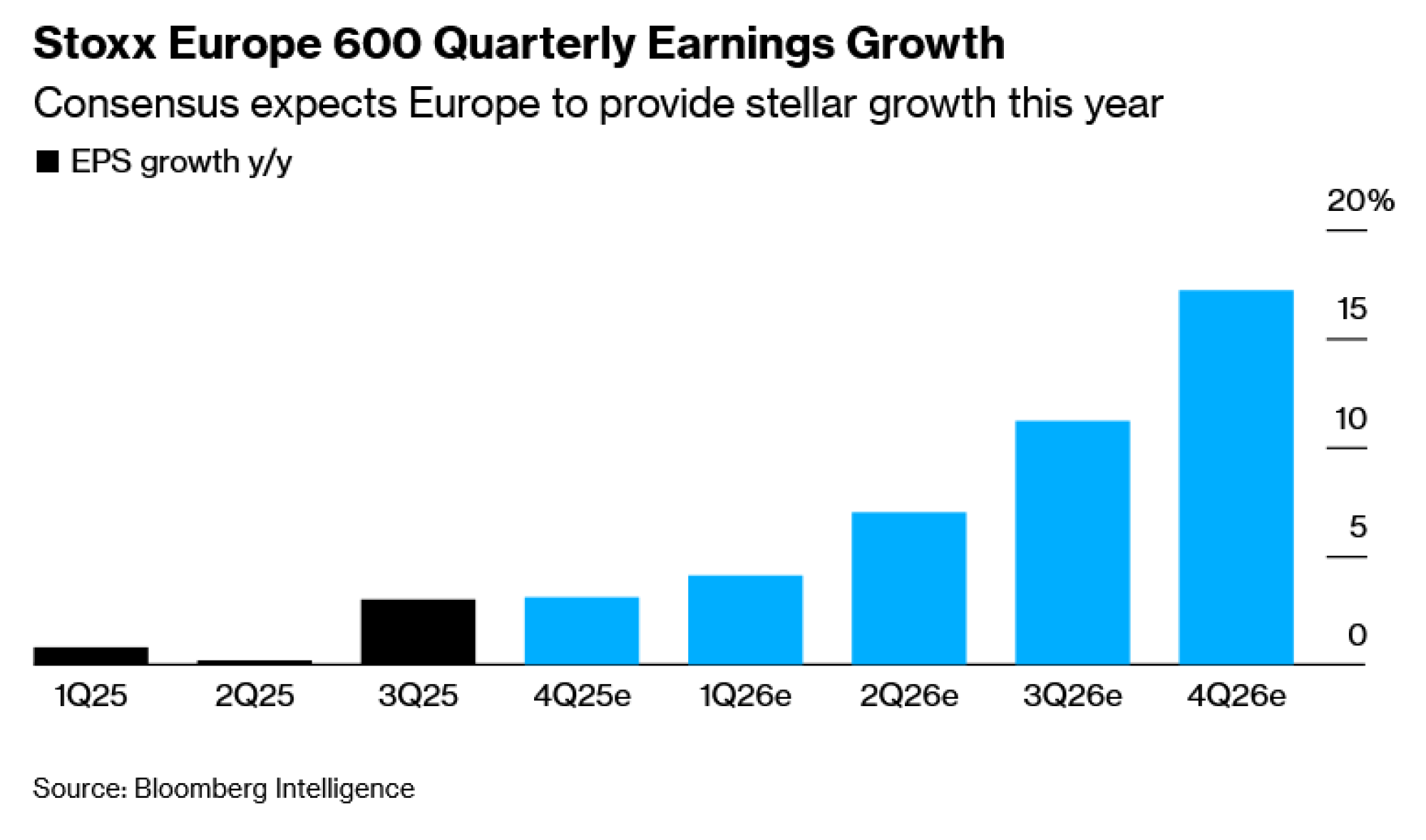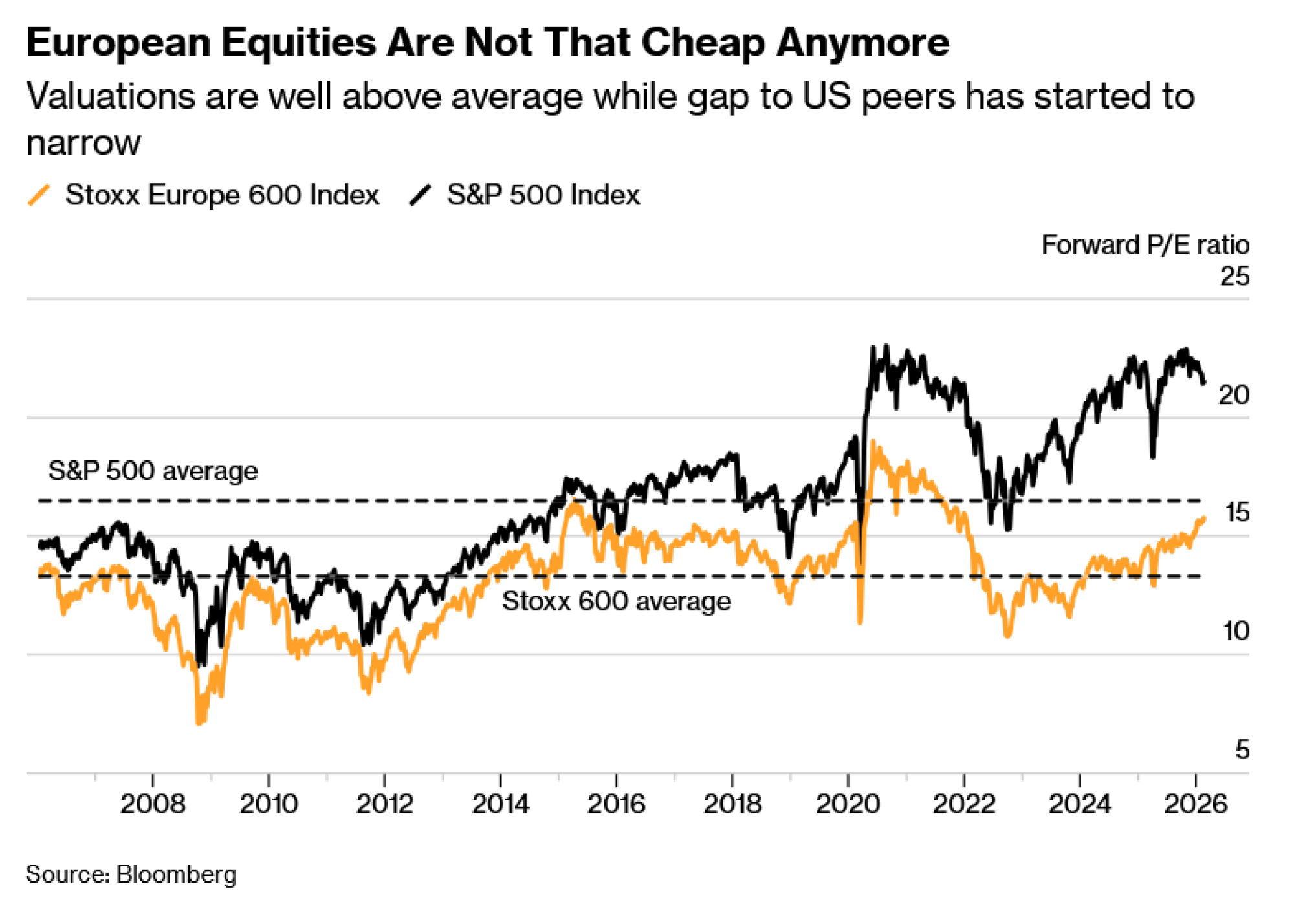 "Europa je i dalje tržište divergencija potaknutih valutama, carinama, fiskalnim poticajima, kao i primjenom umjetne inteligencije te tržišnim poremećajima koje ona uzrokuje", rekao je Gerry Fowler, voditelj strategije za europske dionice u tvrtki UBS Group AG. "Rast indeksa i dalje je spor s obzirom na veliku disperziju dionica, ali pritisak međunarodnih investitora na strani kupnje nastavlja podupirati valuacije indeksa."