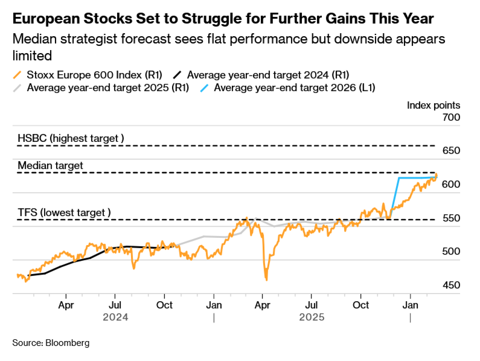 Indeks Stoxx Europe 600 završit će 2026. godinu bez značajnijih pomaka u odnosu na povijesni rekord od 630 bodova zabilježen u srijedu, prema medijanu 17 prognoza iz ankete Bloomberga. Stratezi smatraju da su povoljni faktori koji su gurali dionice u regiji uglavnom već iscrpljeni, dok se očekivanja o dvoznamenkastom rastu korporativnih zarada čine preambicioznima.