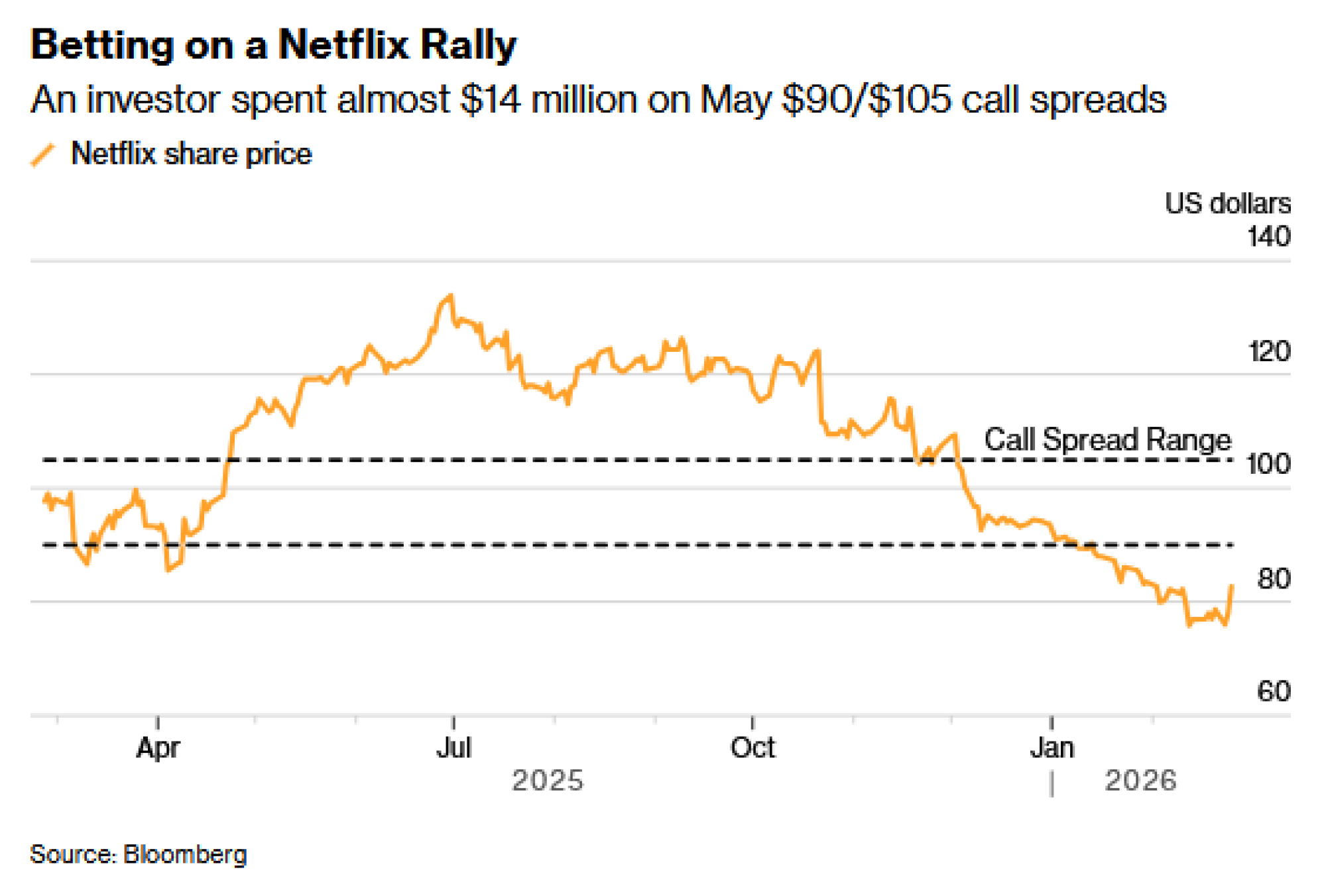 Čini se da jedan trgovac opcijama ulaže gotovo 14 milijuna dolara na to da će Netflix Inc. profitirati ako izgubi u svojoj ponudi za preuzimanje Warner Bros. Discovery Inc..