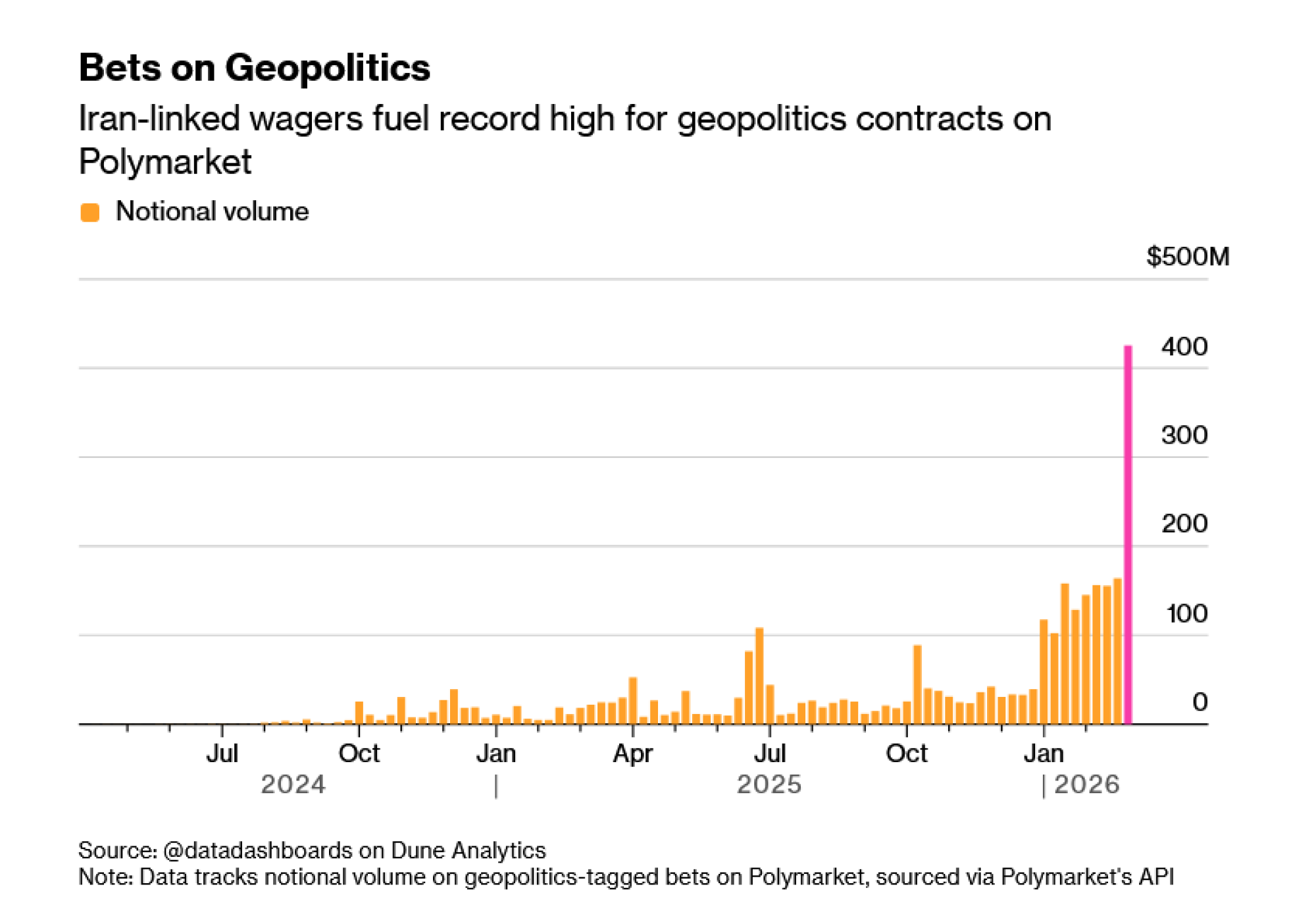 Kladioničari su na platformi Polymarket uložili 425,4 milijuna dolara na geopolitička pitanja u tjednu koji je završio 1. ožujka, što je porast u odnosu na 163,9 milijuna dolara tjedan ranije, prema podacima na platformi Dune Analytics. Ukupni iznosi oklada na cijeloj stranici dosegli su rekordnih 2,4 milijarde dolara, u odnosu na 1,8 milijardi dolara tjedan dana ranije.