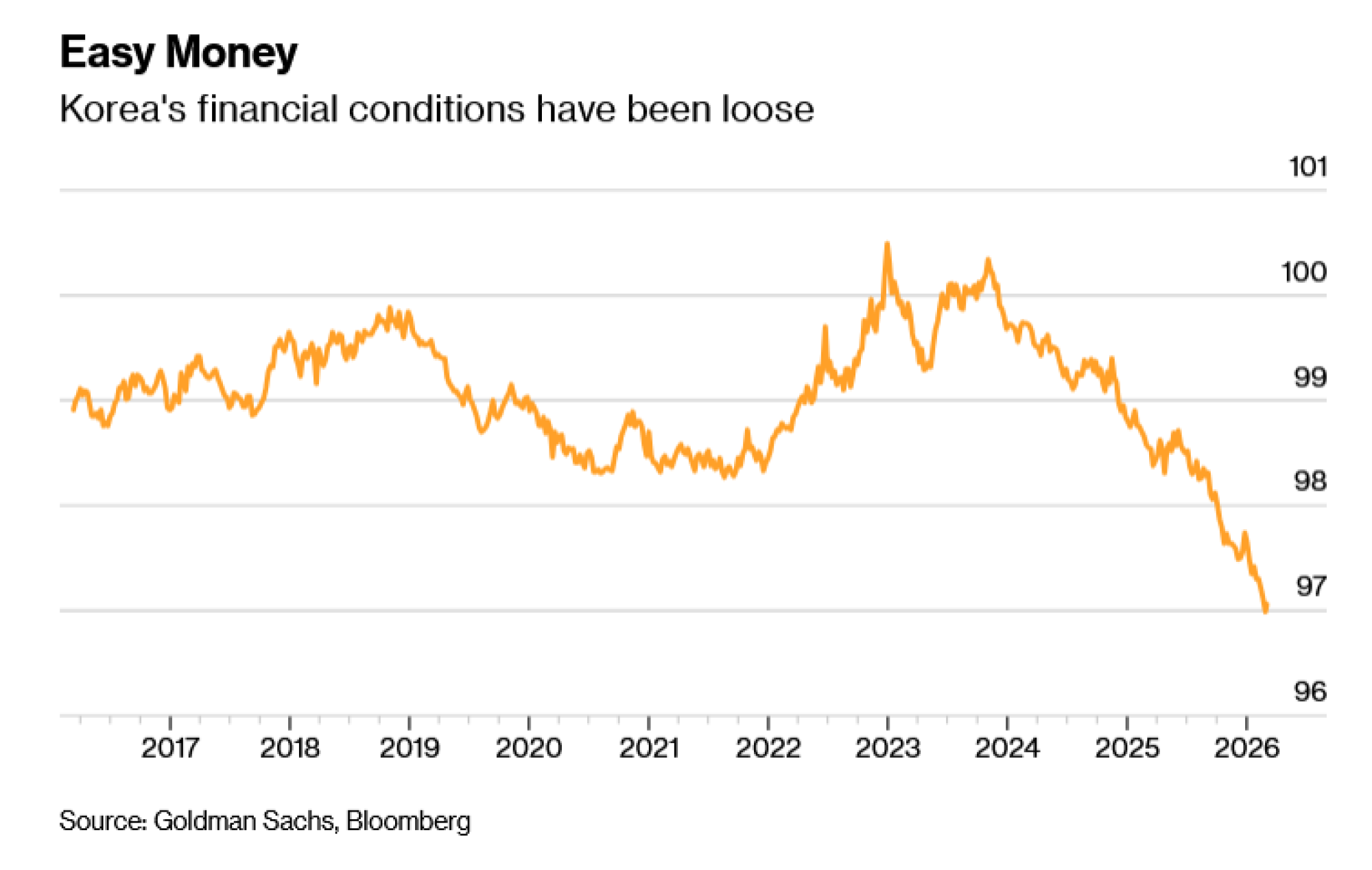 Kako se konflikt u Iranu odugovlači, kapital se počinje povlačiti. Naglo jačanje američkog dolara narušava argumente za ulaganje u tržišta u nastajanju. Istovremeno, postoji zabrinutost da će lokalne referentne kamatne stope morati rasti jer produženi naftni šok potiče inflaciju. Više kamatne stope na tržištu novca povećavaju troškove trgovanja financiranog maržom. Do nedavno su financijski uvjeti u Koreji bili na najnižim razinama u posljednjih nekoliko desetljeća.
