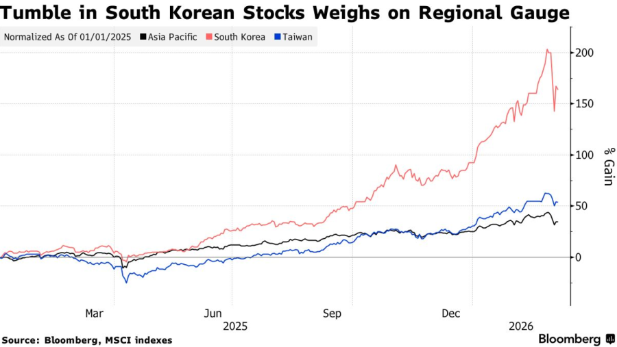 Američko-izraelski napadi na Iran imali su veći utjecaj na Aziju nego na Wall Street, pri čemu je tehnološki snažno zastupljen korejski referentni indeks prošlog tjedna pretrpio najveću rasprodaju u povijesti. Kako su investitori zatvarali pozicije izgrađene uz korištenje posuđenog novca, panična prodaja zahvatila je tržište i srušila dionice čipovskih divova Samsung Electronics Co. i SK Hynix Inc.