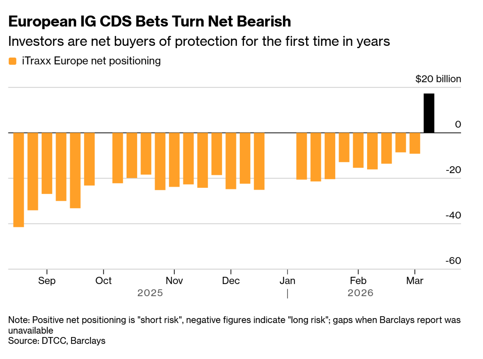 Neto kupnja ugovora na indeks iTraxx Europe, što je način na koji su ulagači osiguravaju od bankrota tvrtki, iznosila je 17 milijardi dolara krajem prošlog tjedna, na temelju podataka DTCC-a koje je sastavio Barclays Plc. To je najveći iznos kratkih pozicija u najmanje tri godine, prema analitičarima Barclaysa. Ovaj trend uslijedio je nakon godina neto prodaje od strane upravitelja novca koji su se kladili na opći rast kredita investicijskog rejtinga.