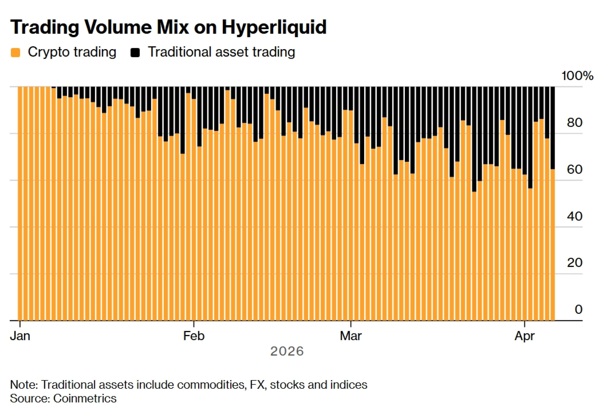 Godwin je izjavio da te pozicije drže malima, s obzirom na nemogućnost istovremenog korištenja kolaterala na blockchain platformama i kod tradicionalnih brokera. No, ovaj se obrazac širi industrijom. Istraživanje grupe Crypto Insights provedeno među 51 upraviteljem fondova koji nadziru više od 3 milijarde dolara pokazalo je da četvrtina njih očekuje da će većina novih aktivnosti na Hyperliquidu dolaziti od tradicionalne imovine, dok gotovo polovica predviđa podjednaku podjelu između kripto i nekripto trgovanja.