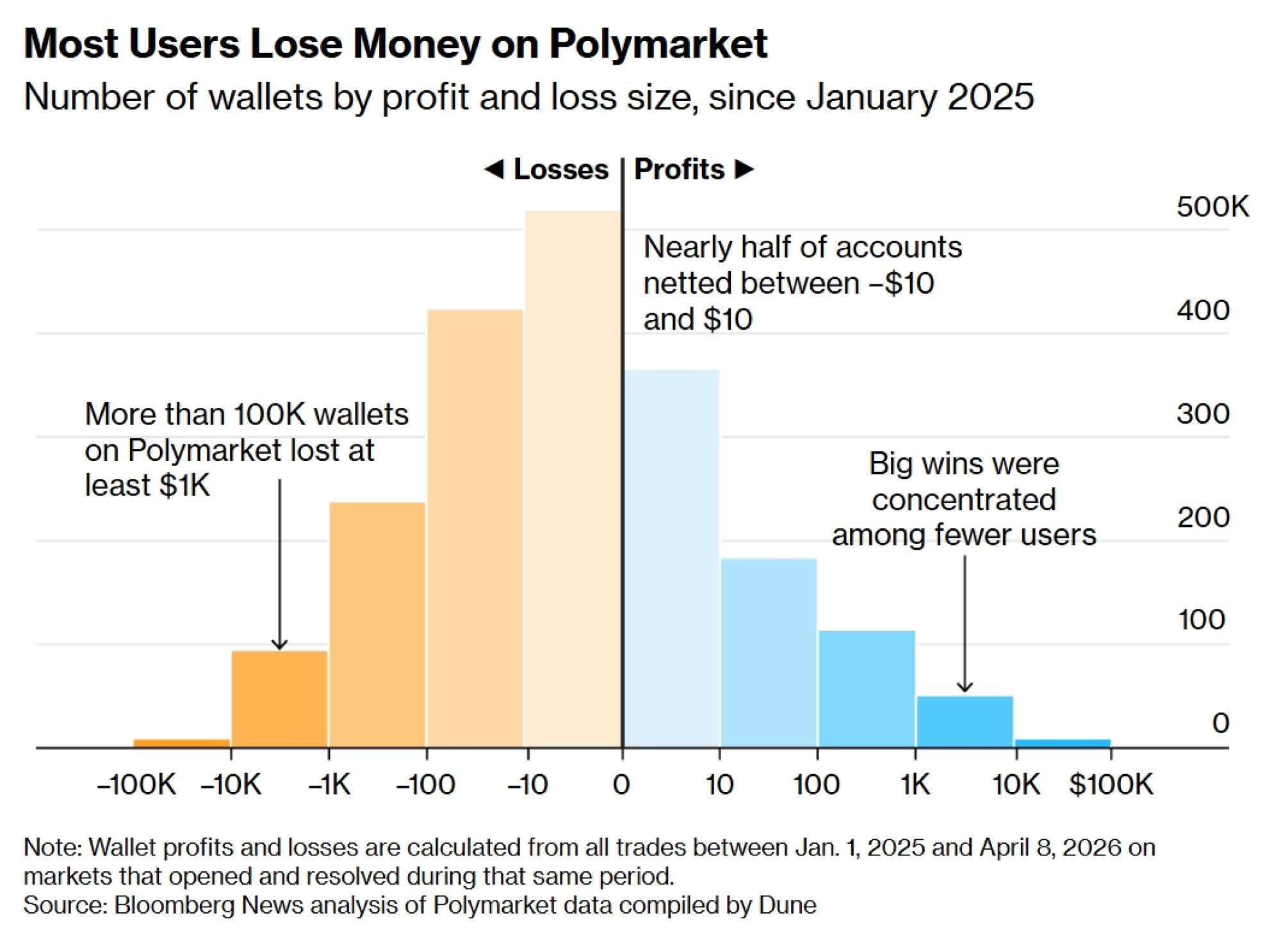 Više od 100.000 računa izgubilo je najmanje 1000 dolara na Polymarketu, jednom od najvećih tržišta predviđanja, prema analizi Bloomberg Newsa svakog novčanika aktivnog od početka 2025. godine. To je gotovo dvostruko više od broja onih koji su zaradili barem toliko.