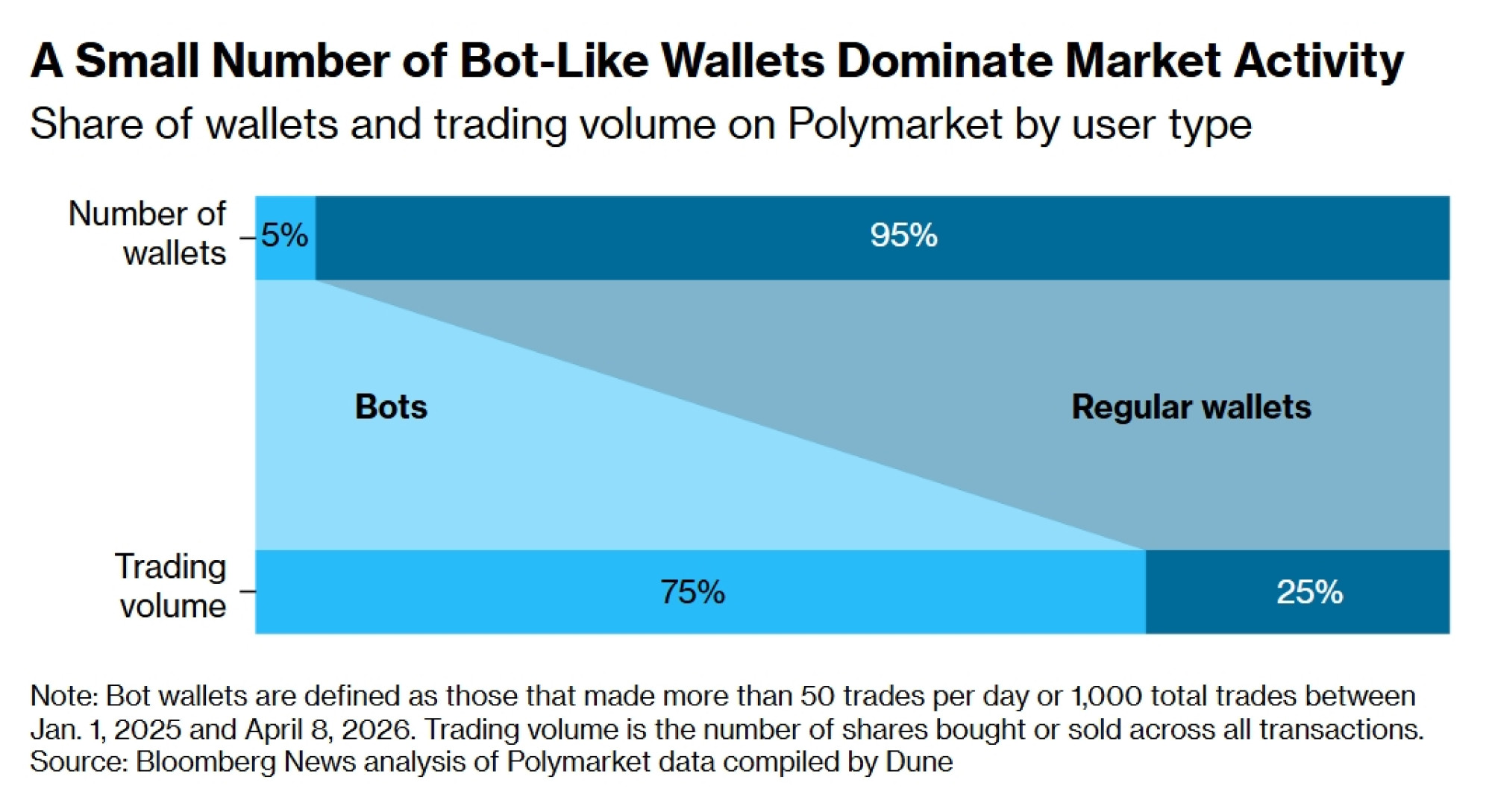 Iako su tržišta predviđanja opisana kao peer-to-peer (izravno među korisnicima), zapisi Polymarketa sugeriraju da ulogu kladionice sada uglavnom igraju automatizirani, visokofrekventni trgovci koji već dugo dominiraju drugim financijskim tržištima. Najaktivniji računi na stranici činili su mali udio novčanika, ali su bili zaslužni za većinu volumena trgovanja.