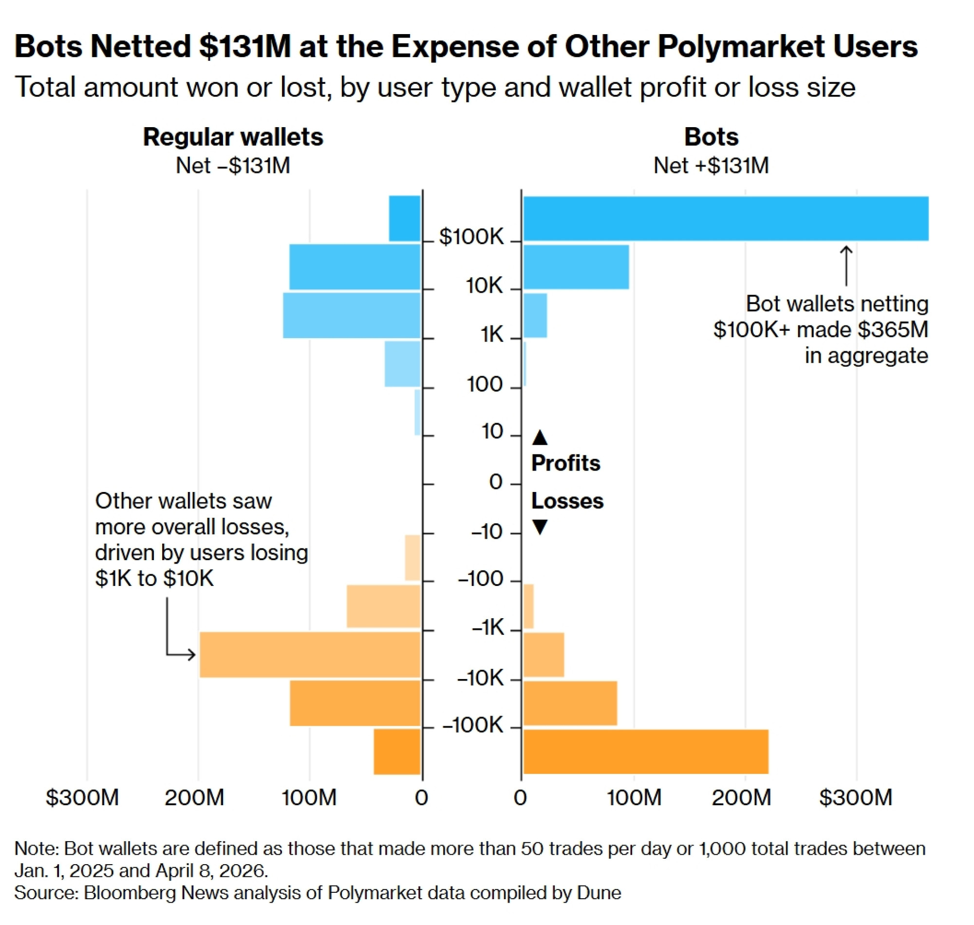 Među dobitnicima, većinu profita prikupio je sićušni dio onoga što se čini da su automatizirani botovi, na temelju zapisa o trgovanju na Polymarketu koje je prikupila podatkovna tvrtka Dune. Svi ostali su, ukupno gledano, izgubili 131 milijun dolara.