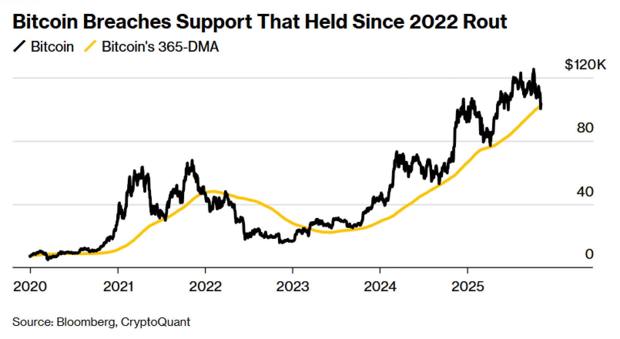 Podaci tvrtke za analizu tržišta CryptoQuant pokazuju kako pad bitcoina ispod 365-dnevnog pokretnog prosjeka blizu 102.000 dolara mogao biti signal snažnijeg povlačenja. Ta razina podrške, koja je bila stabilna od početka 2023. godine, sada pokazuje znakove pucanja.