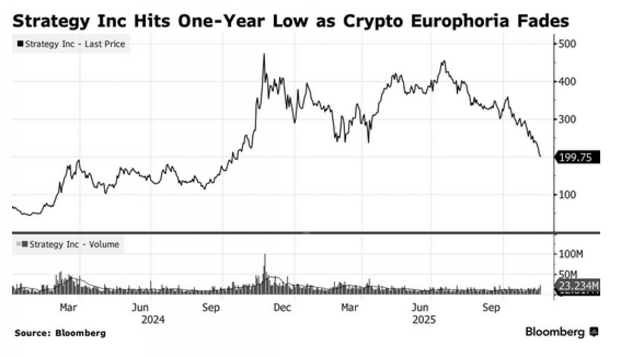 Jedan od najočitijih primjera naglog kupovanja u zajednici digitalne imovine dolazi od tvrtke Michaela Saylora Strategy Inc., softverske tvrtke koja je postala sakupljač bitcoina. Nekada uzor za korporativne kriptovalute, njihova dionica sada se približava paritetu s njihovim zalihama bitcoina - znak da investitori više nisu spremni plaćati premiju za Saylorov model visoke poluge.