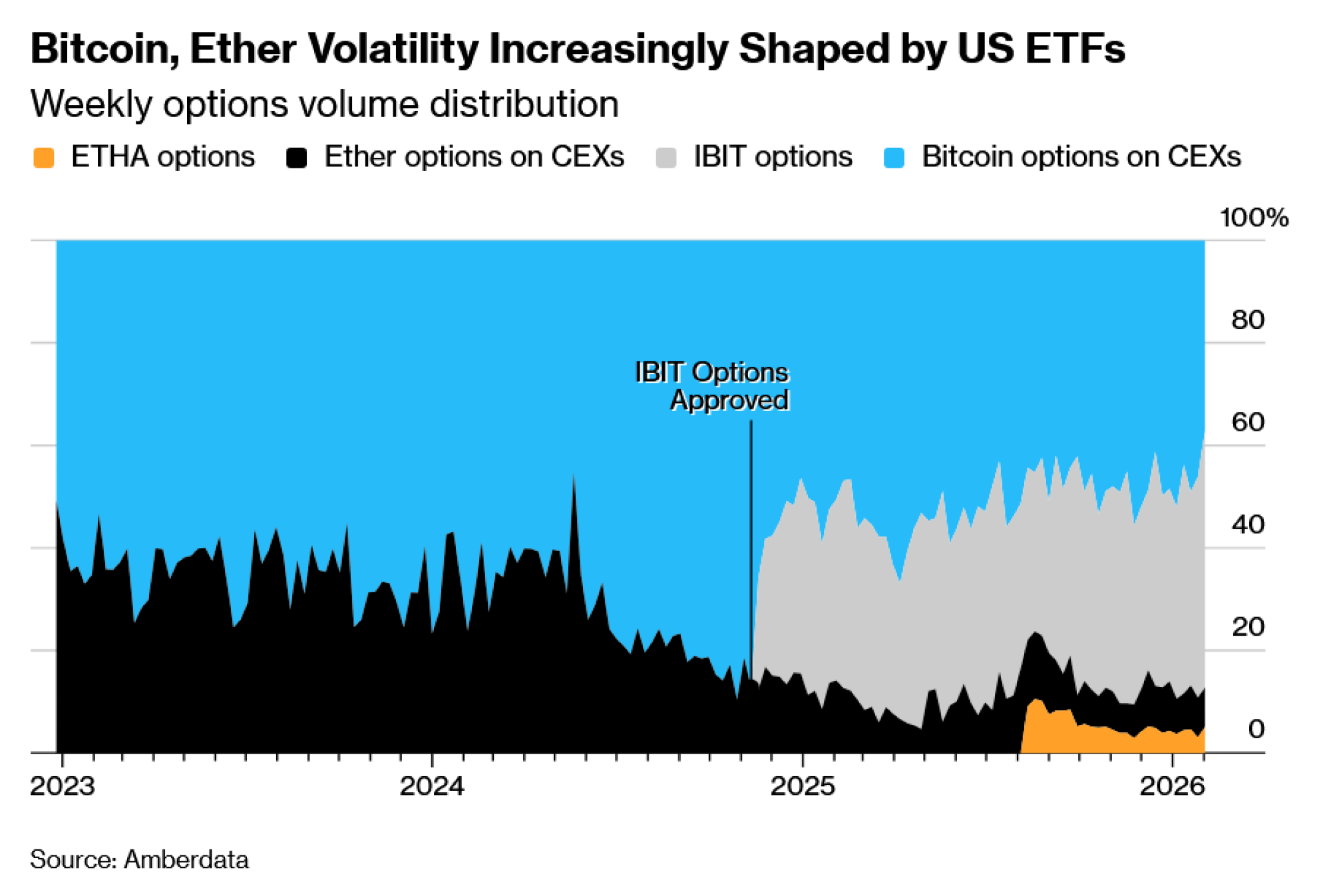 Otkad su odobrene opcije na bitcoin i ether fondovima kotiranim na američkim burzama, te su strategije prestigle izvorne kripto burze. Ugovori povezani s IBIT-om i ETHA-om sada čine više od polovice ukupnog volumena opcija za te tokene, prema podacima tvrtke Amberdata.